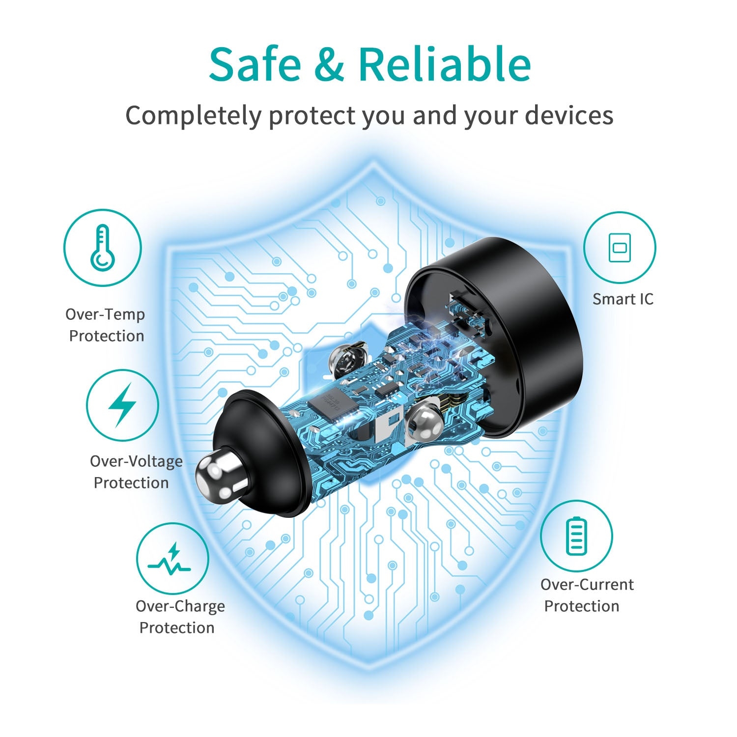 This car charger features dual USB-C ports with fast charging capabilities, supporting multiple fast charge protocols and delivering a total output of up to 40W. It allows simultaneous fast charging for two devices, including popular smartphones and tablets, ensuring efficient power delivery on the go.