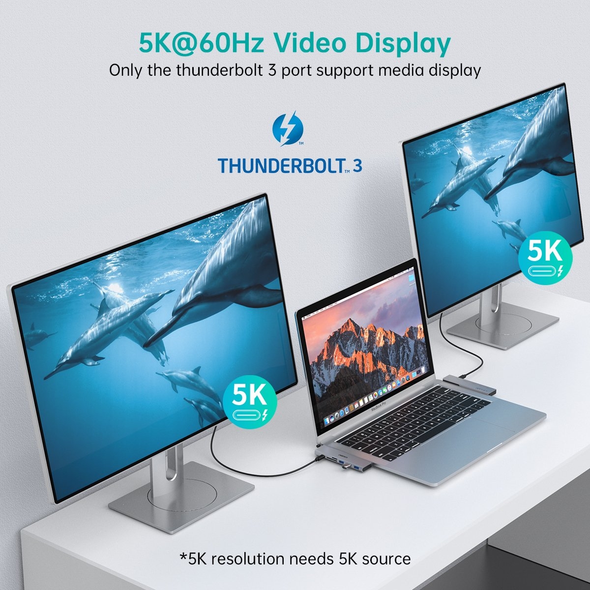 - Thunderbolt 3 port supports data transfer up to 40 Gbps, 5K display output, and 100W power delivery