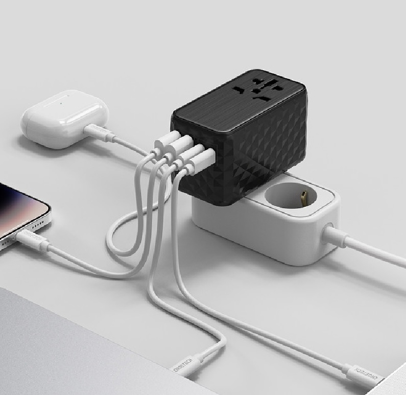 This travel wall charger features multiple ports and advanced technology to provide efficient and versatile charging solutions for various devices worldwide. It supports fast charging protocols and is designed for convenience during international travel.