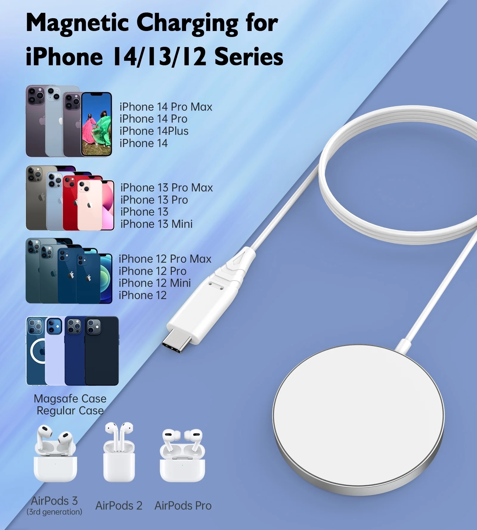 This wireless magnetic charger features a premium aluminum design, offering a sleek metal feel and a compact, portable build for convenient charging. It supports fast wireless charging, providing up to 15W for compatible devices, and maintains compatibility with Qi charging standards for broader device support.