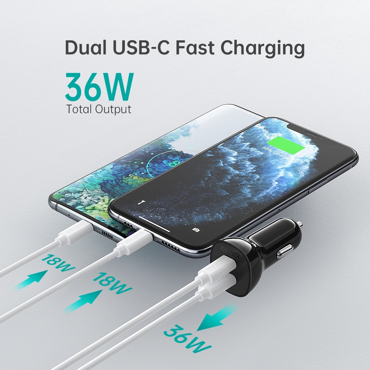 CHOETECH TC0008-BK Dual USB-C 36W Car Charger Adapter Black