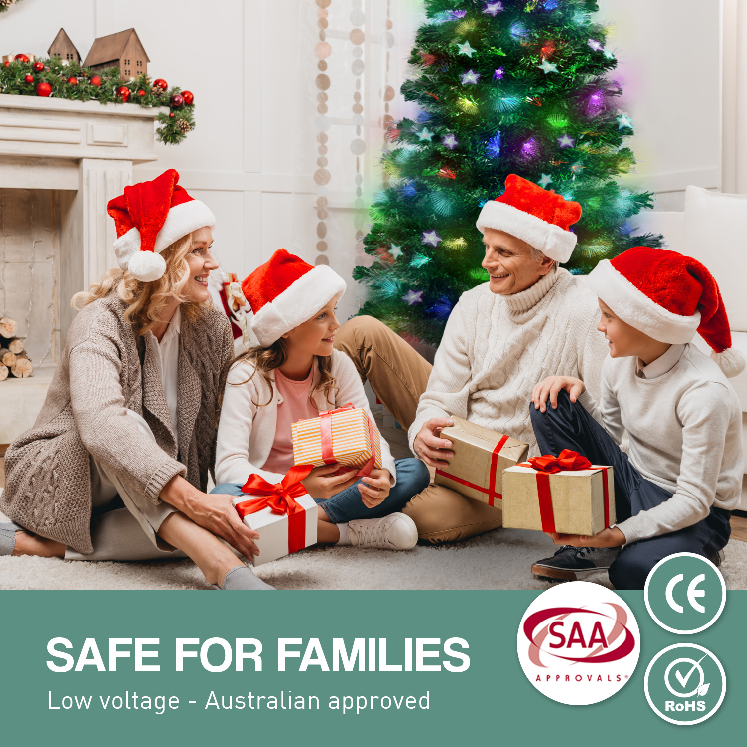 This fibre optic Christmas tree creates a stunning holiday display with multicoloured twinkling lights, built-in star ornaments, and a star tree topper. It is designed to be easy to assemble and disassemble, making storage simple for future seasons. The tree provides ample space for ornaments and decorations, making it an ideal centerpiece for festive celebrations.