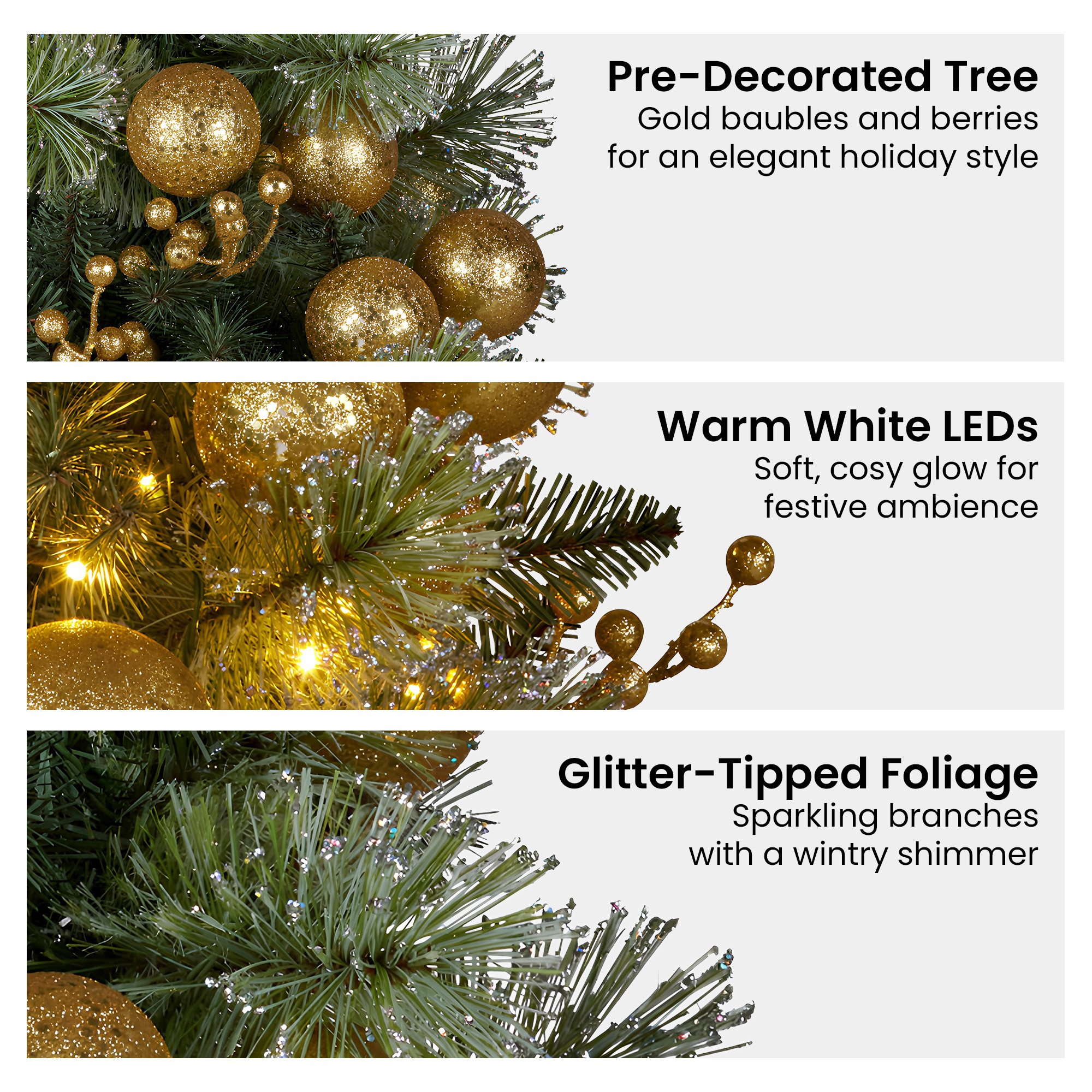 • Pre-decorated with glitter-tipped foliage, baubles, and berries