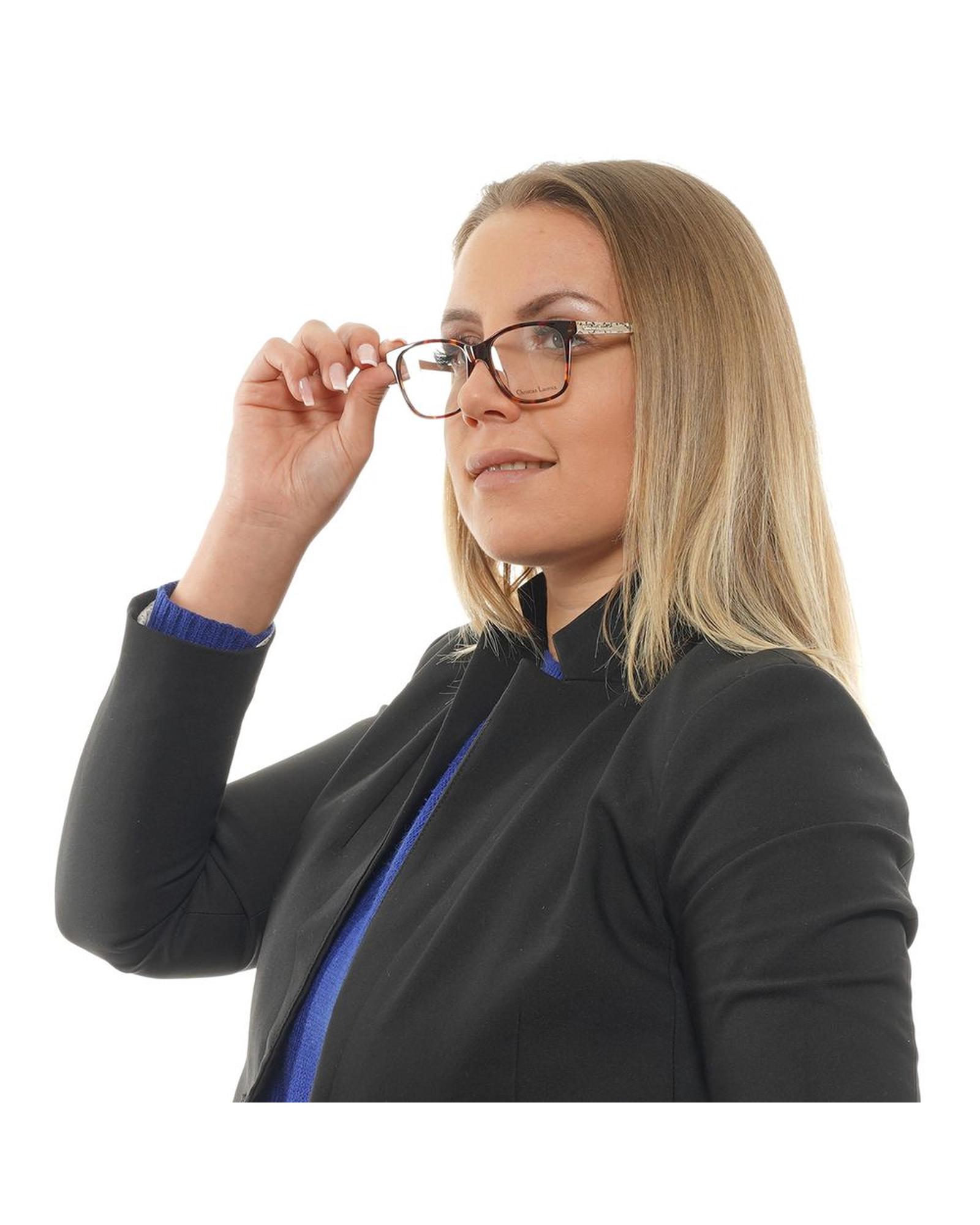 This pair of women’s optical frames features a stylish square design with a full acetate frame in a classic brown color. They are suitable for everyday wear and provide a comfortable fit with a lightweight construction. The lenses are demo glasses made of plastic, offering a clear view without additional effects. The package includes a branded case for protection and easy storage.