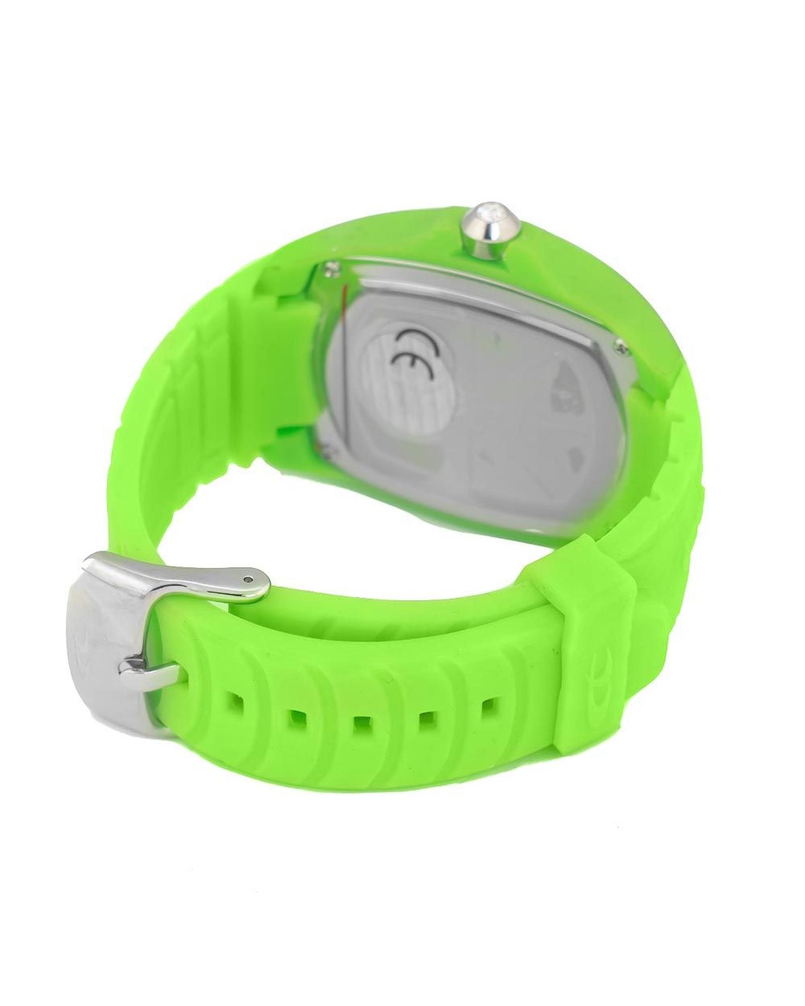 This unisex watch features a vibrant green rubber strap and a matching green case, offering a stylish and modern look. The watch has an analog display with a silver dial, protected by mineral glass, and is powered by a quartz movement for accurate timekeeping. Its versatile design makes it suitable for various occasions.