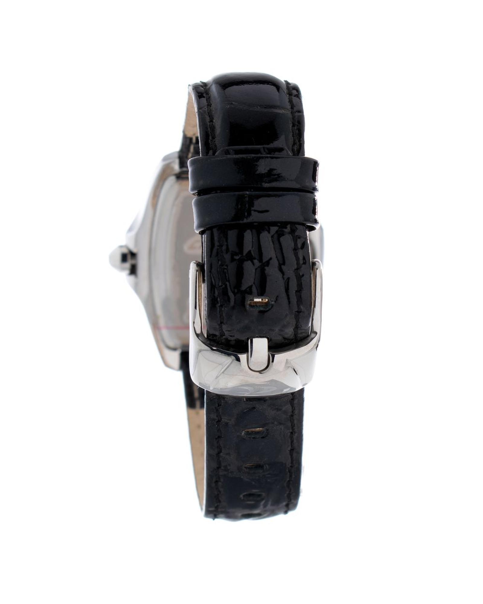 This women’s watch features a classic design with a black leather strap and a sleek silver-toned steel case. It combines elegant style with reliable functionality, making it suitable for various occasions.