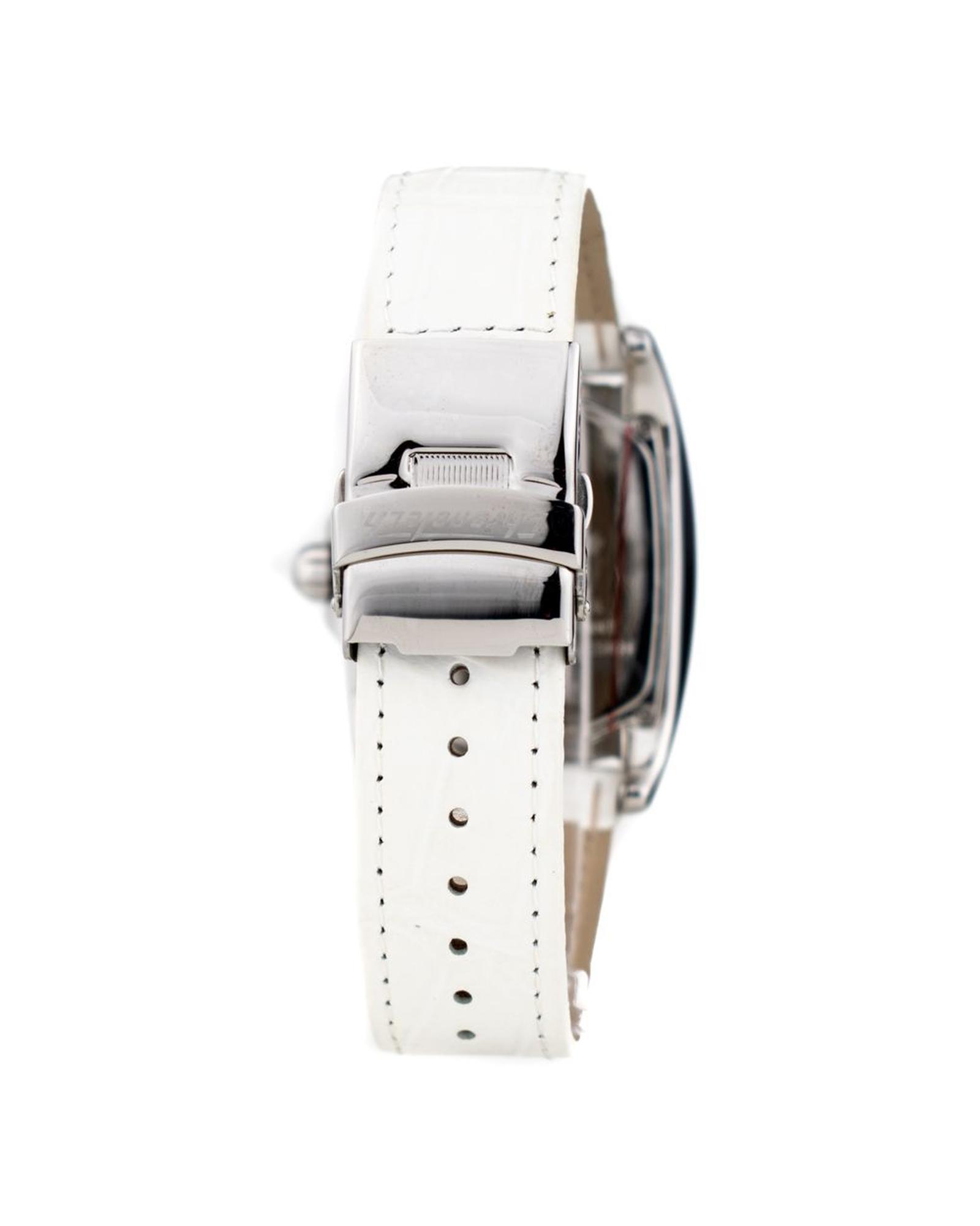 This women’s watch features a classic design with a white leather strap and a sleek silver stainless steel case. It offers reliable timekeeping with a quartz movement and an easy-to-read analog display. The watch is suitable for everyday wear and complements various outfits.