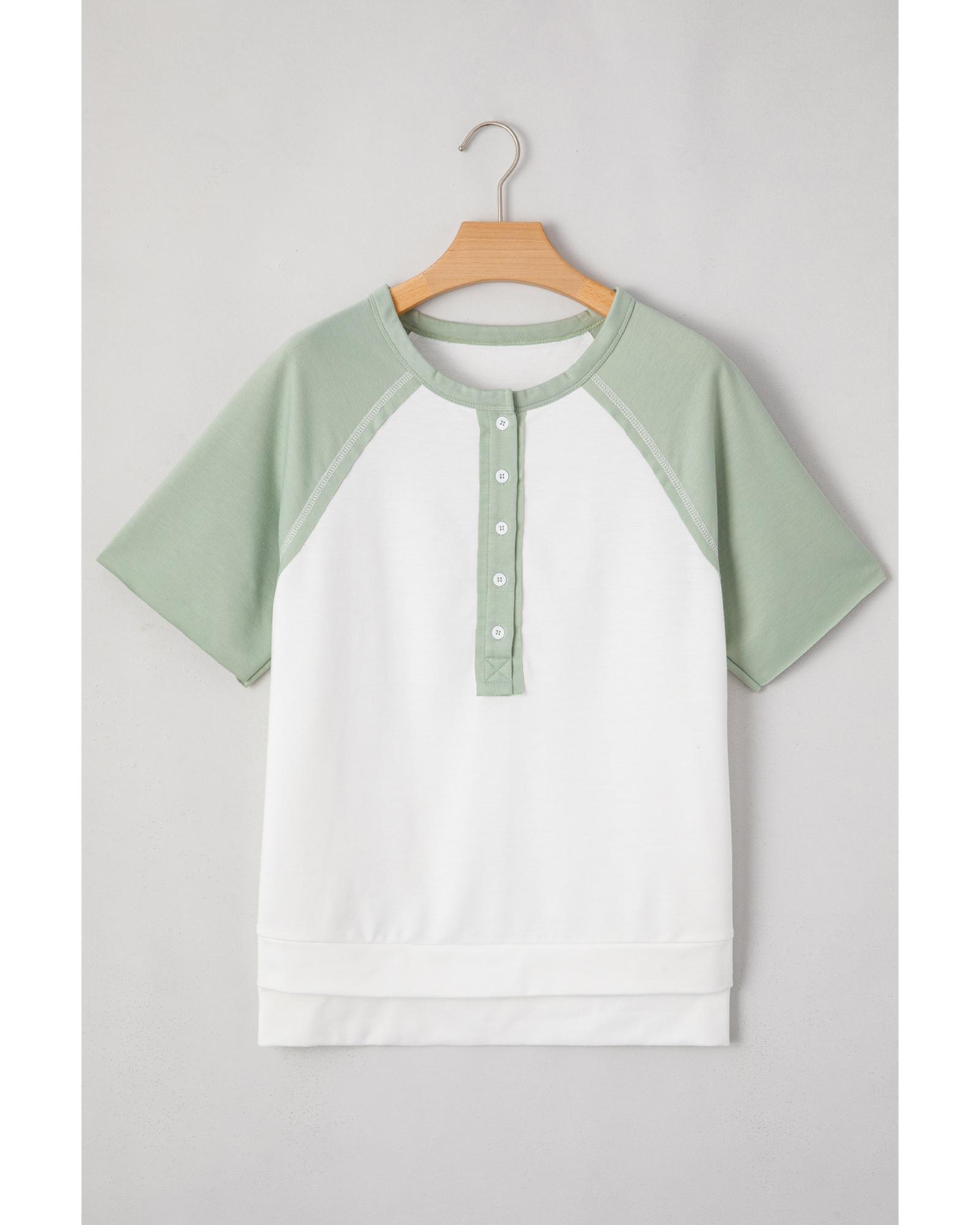Clearly Aqua Colorblock Raglan Short Sleeve Half Buttons High Low T Shirt – M