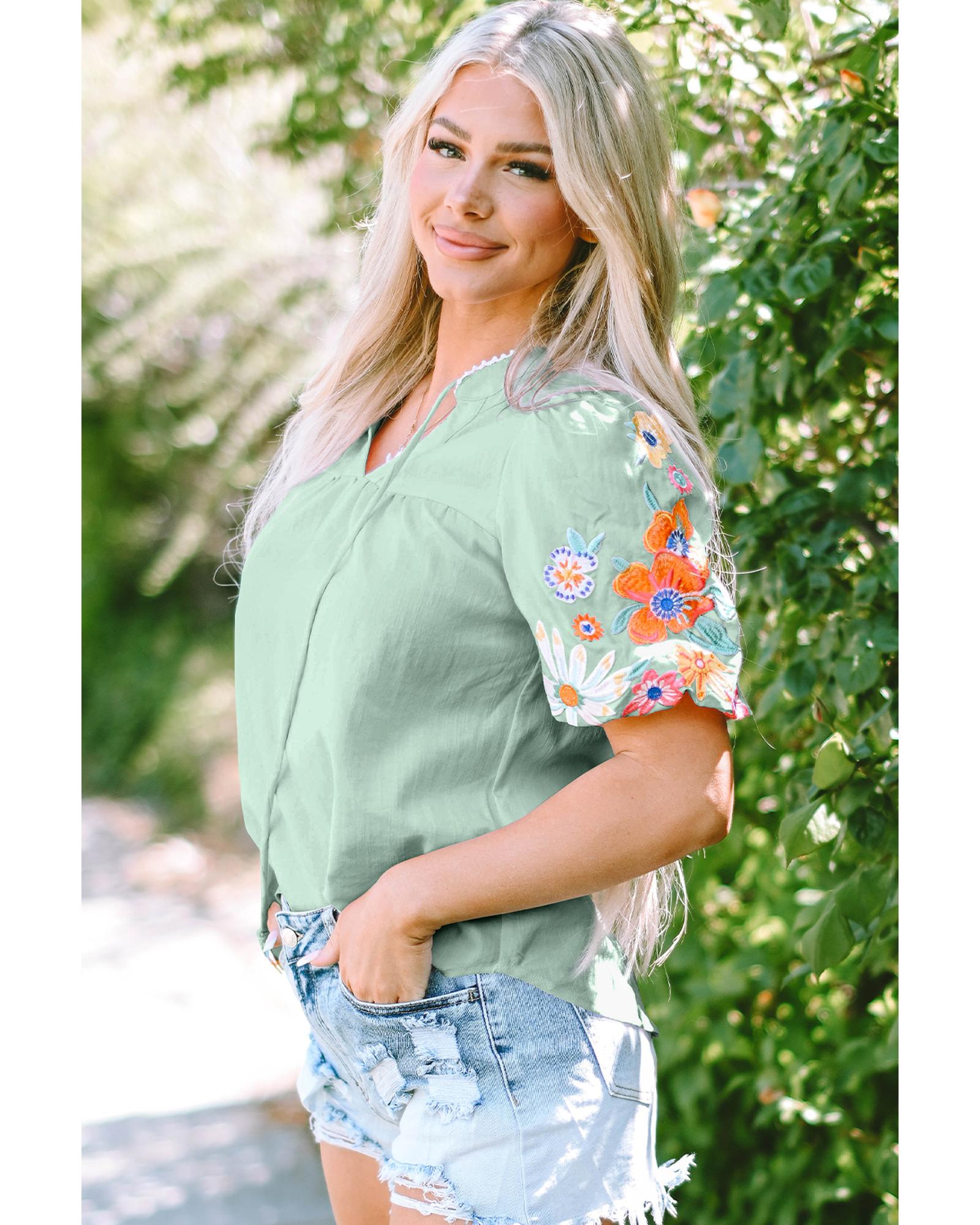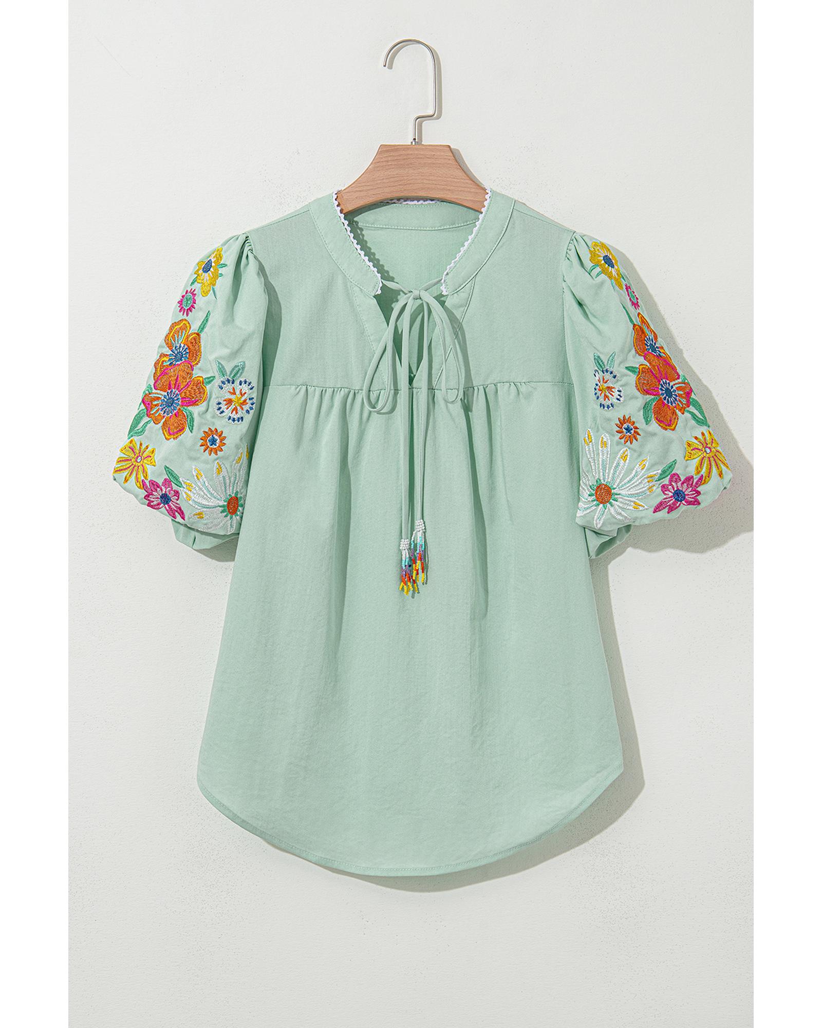 Clearly Aqua Floral Embroidered Puff Sleeve Split Neck Blouse – S