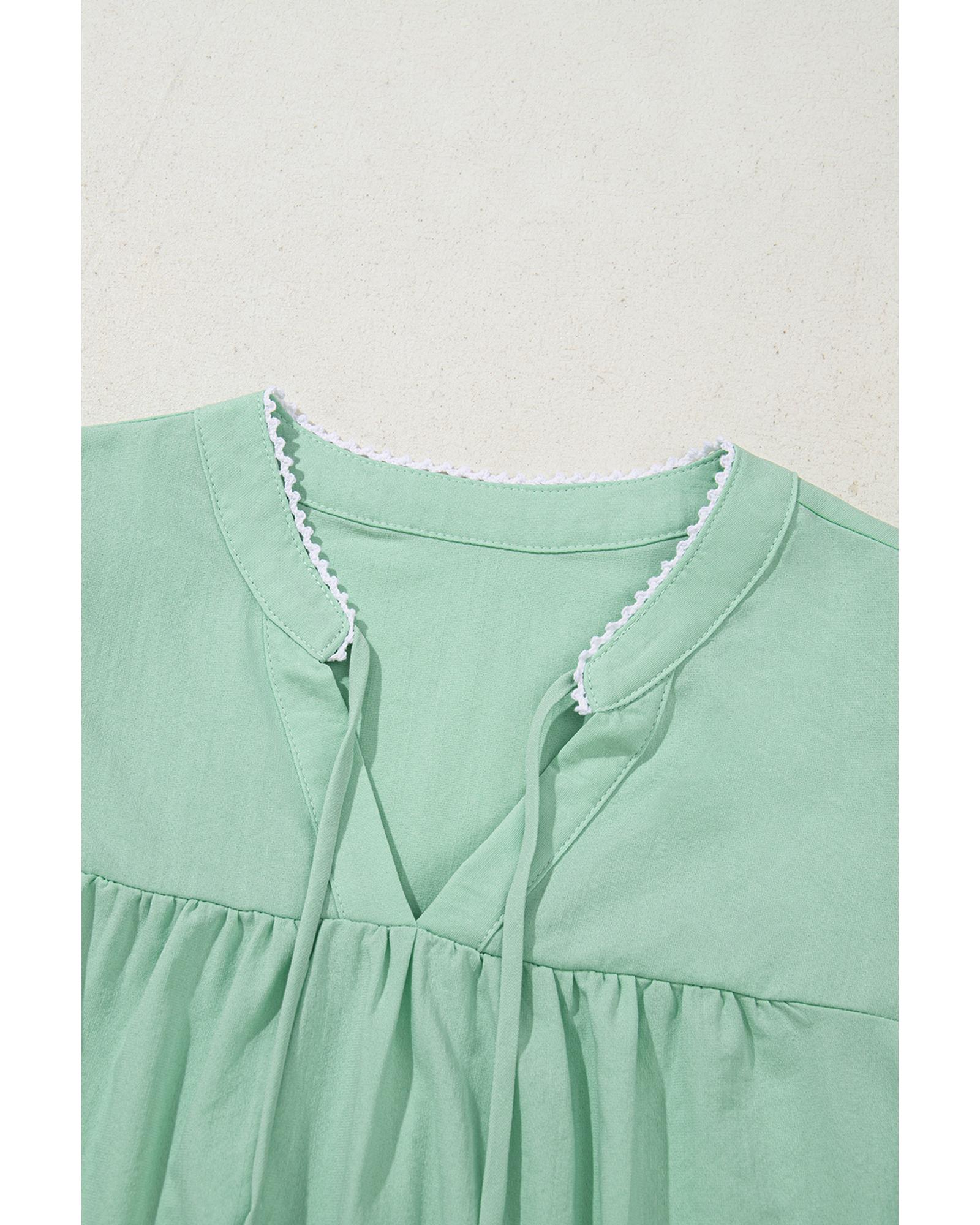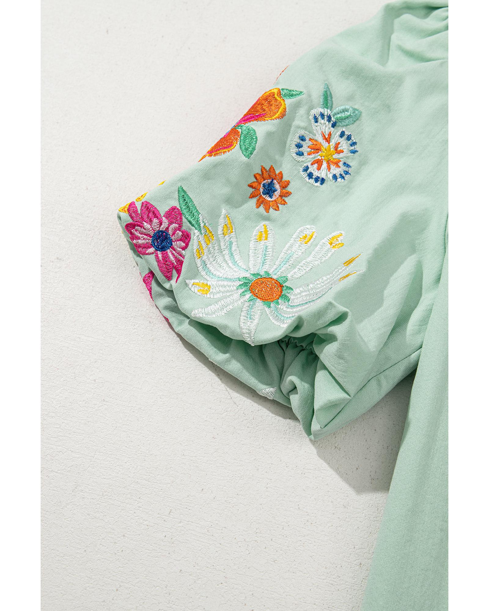 Clearly Aqua Floral Embroidered Puff Sleeve Split Neck Blouse – XL