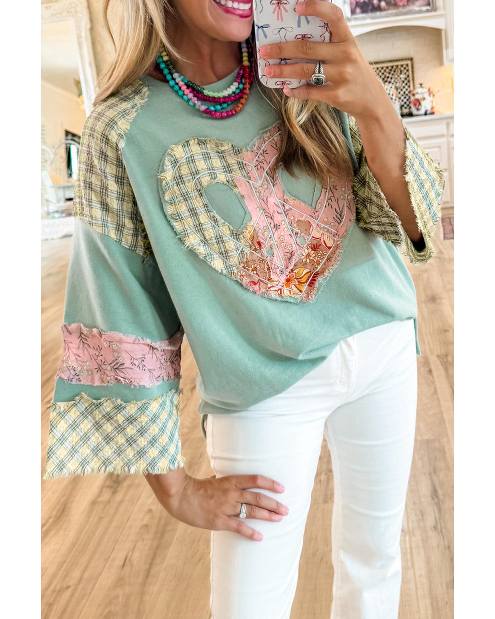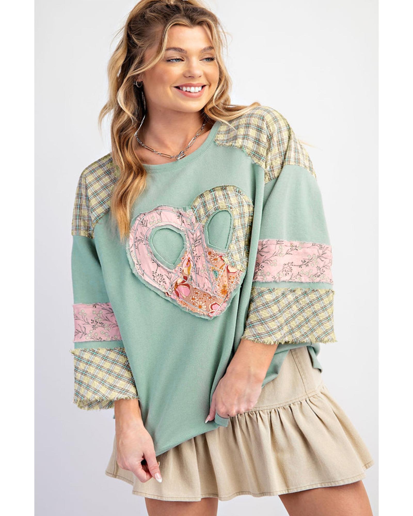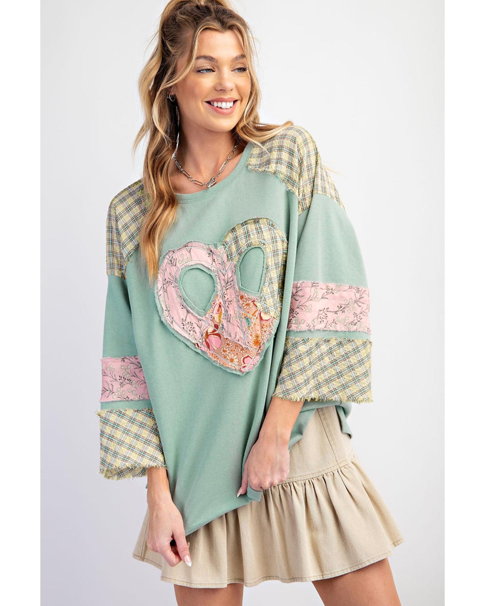 Clearly Aqua Plaid Floral Peace Heart Graphic Wide Long Sleeve Top – M