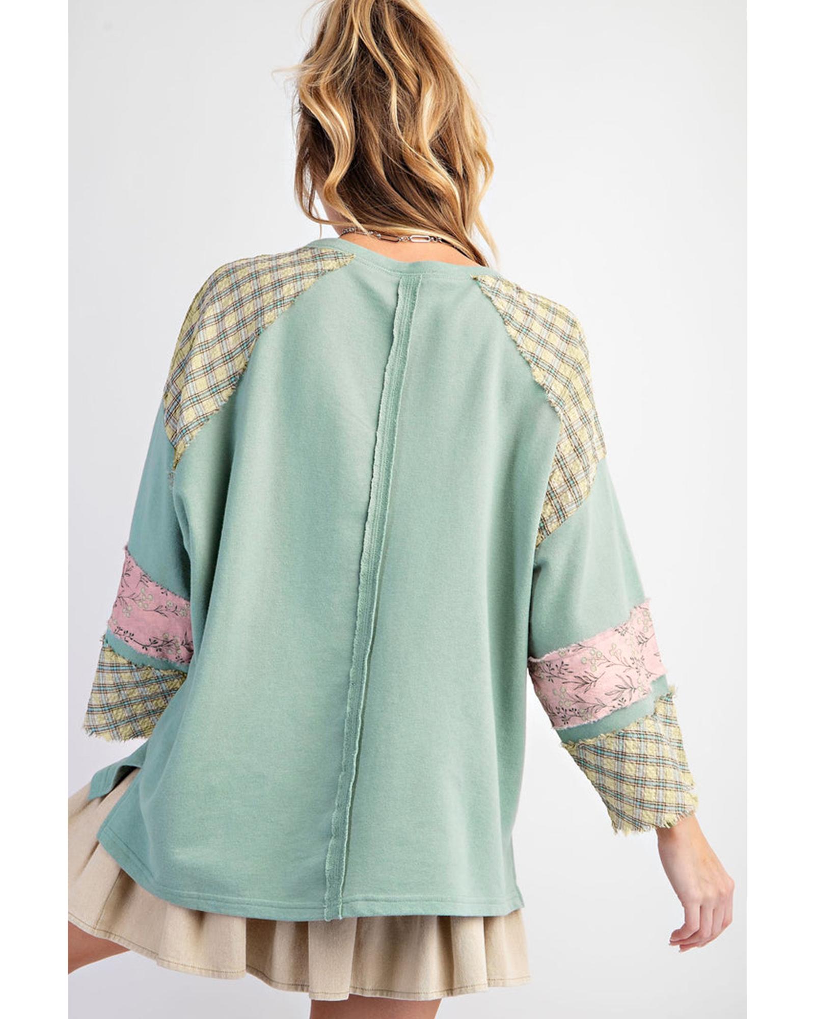 This stylish top features a unique combination of plaid and floral patterns, designed for a trendy and relaxed fit. With its wide long sleeves and eye-catching graphics, it is perfect for casual everyday wear.