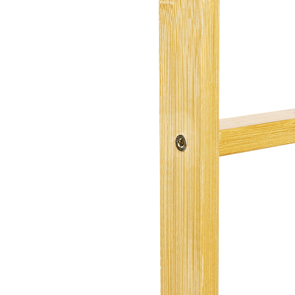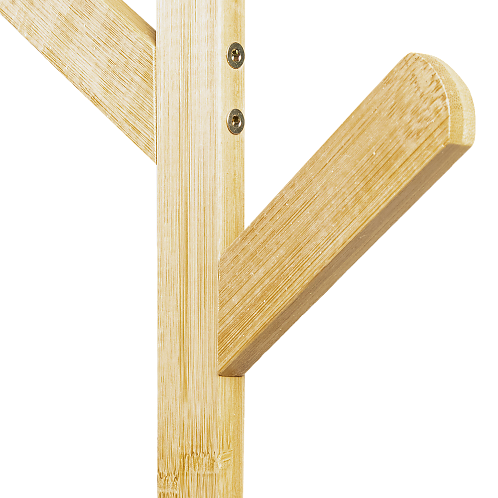 Features include a durable bamboo construction, a neutral natural color, and a minimalist design that complements various home decors. It has six hooks for hanging items, two shelves for storage, and a central rod for hanging clothes. The triangular base ensures stability, and the rounded corners enhance safety. The stand is lightweight, portable, and easy to assemble with included instructions.