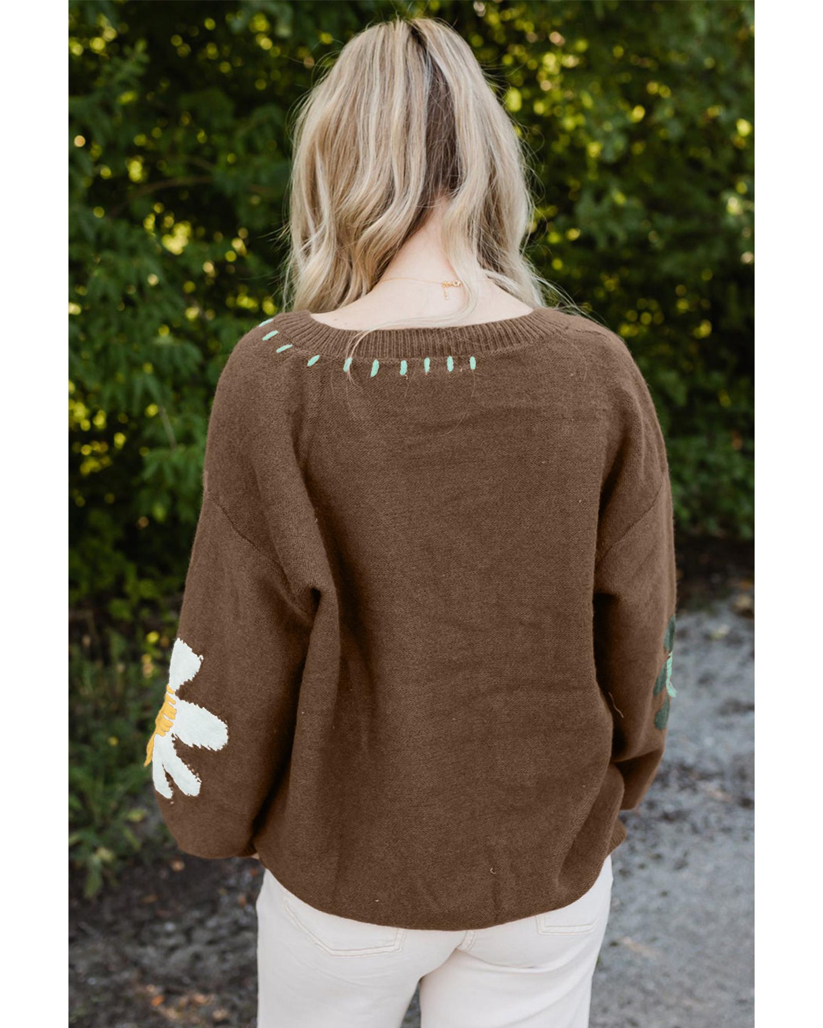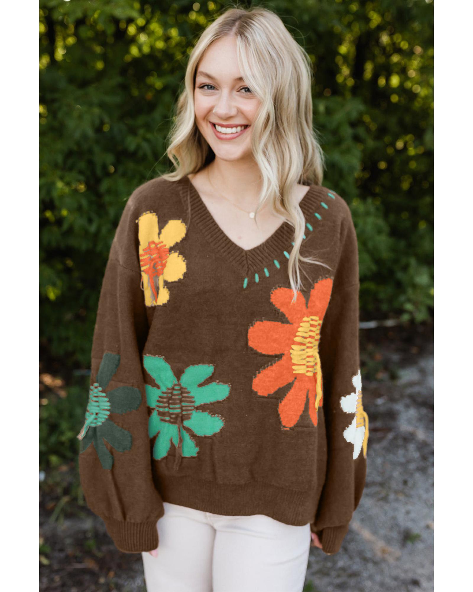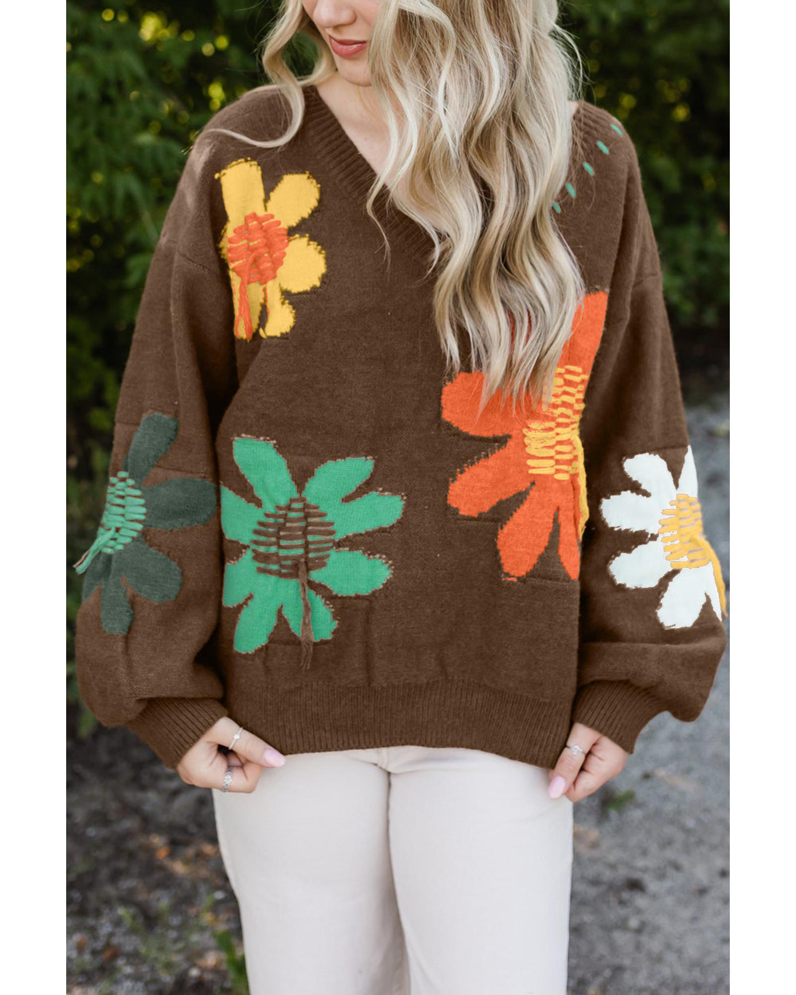 Coffee Big Flower Pattern V Neck Drop Shoulder Sweater – XL