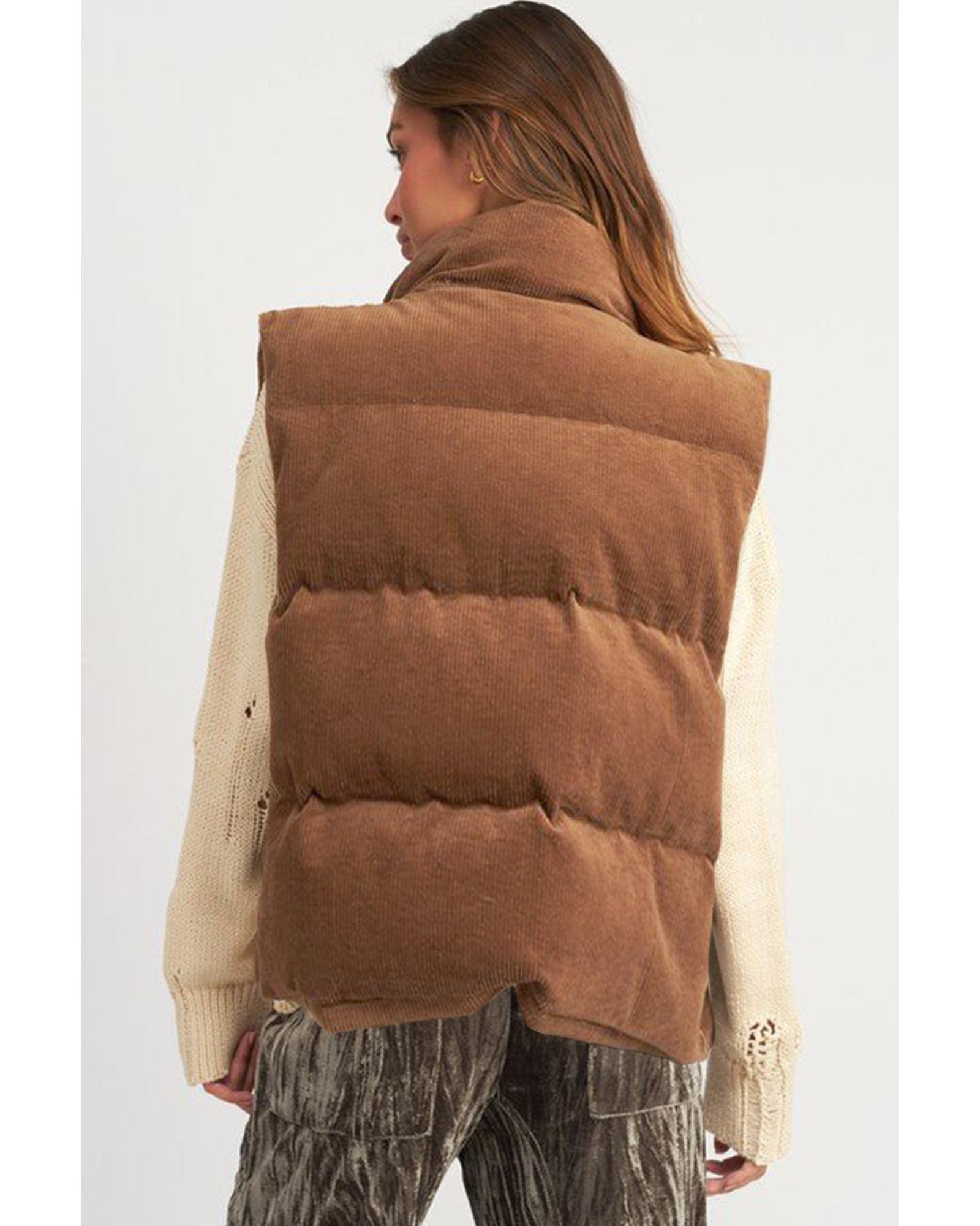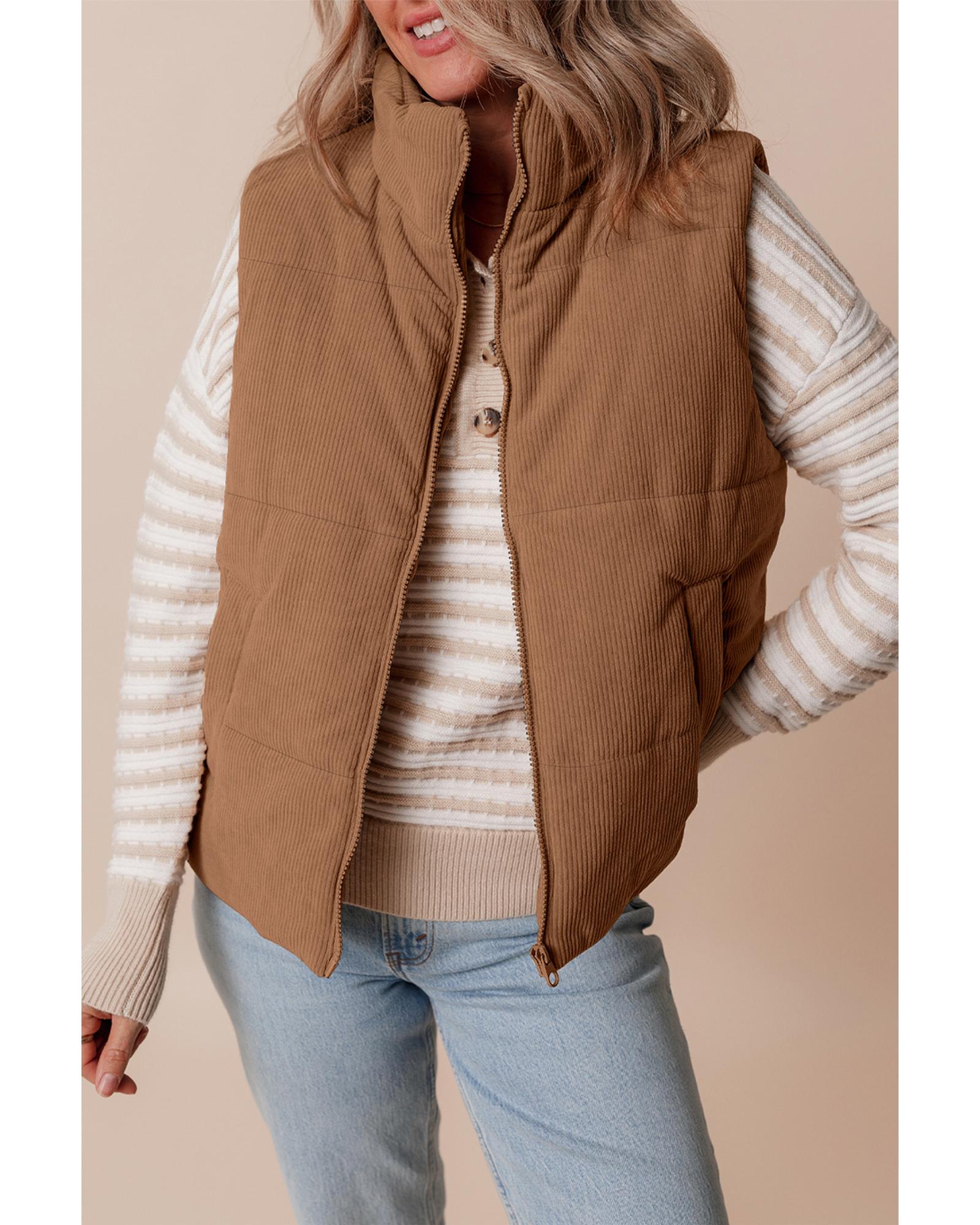 Coffee Corduroy Stand Neck Zipped Puffer Vest – S