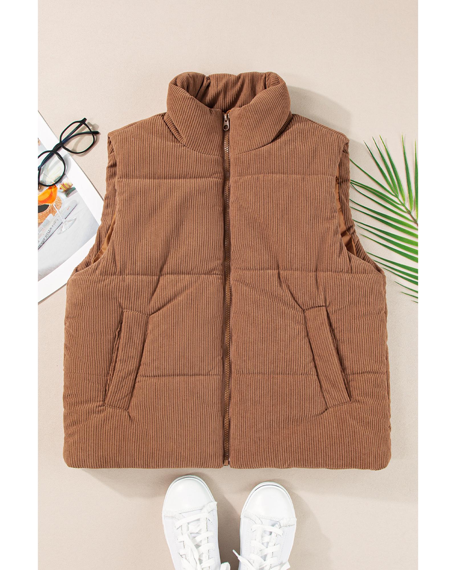 Coffee Corduroy Stand Neck Zipped Puffer Vest – XL