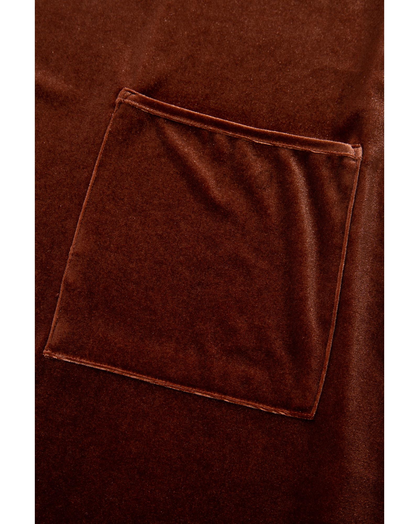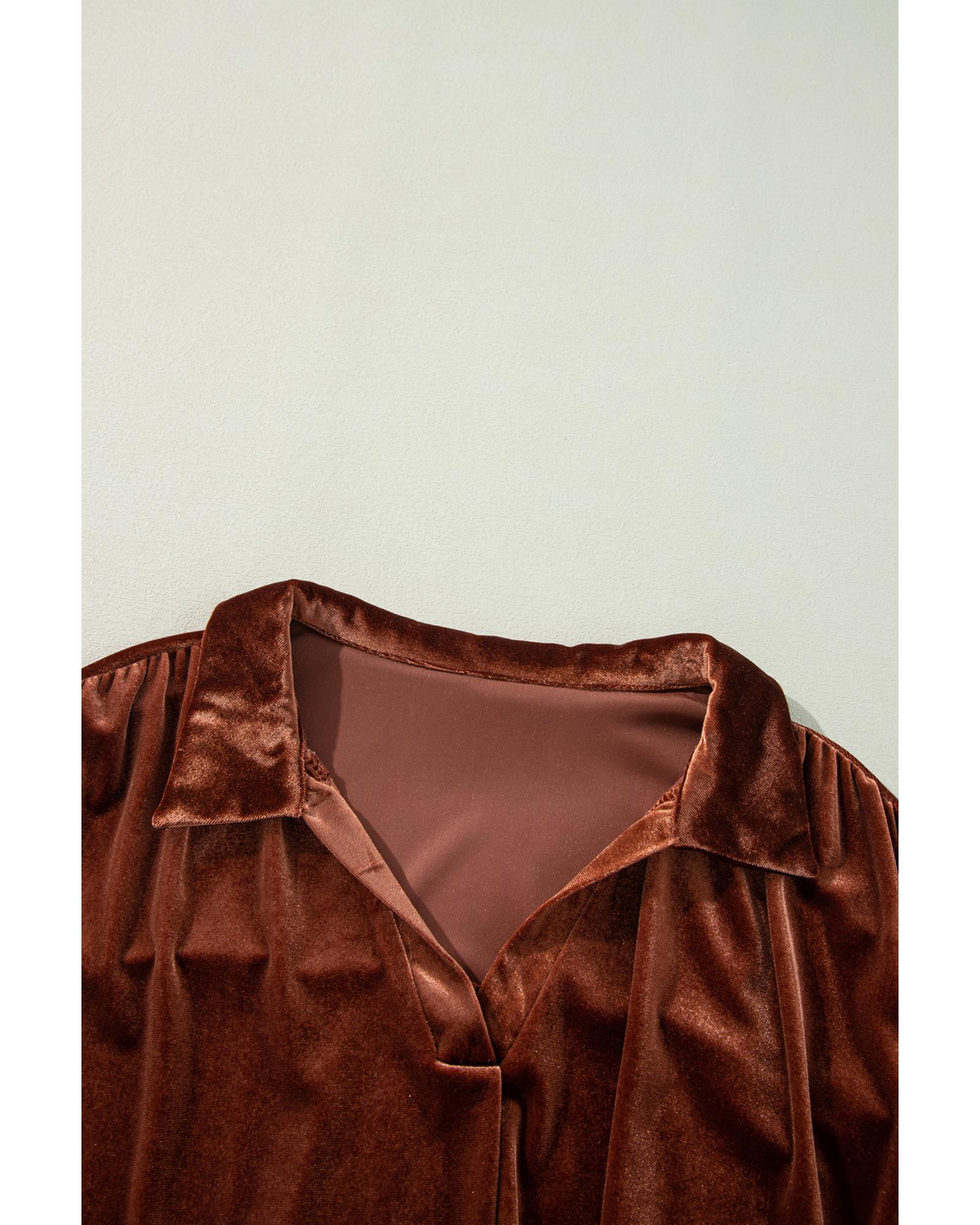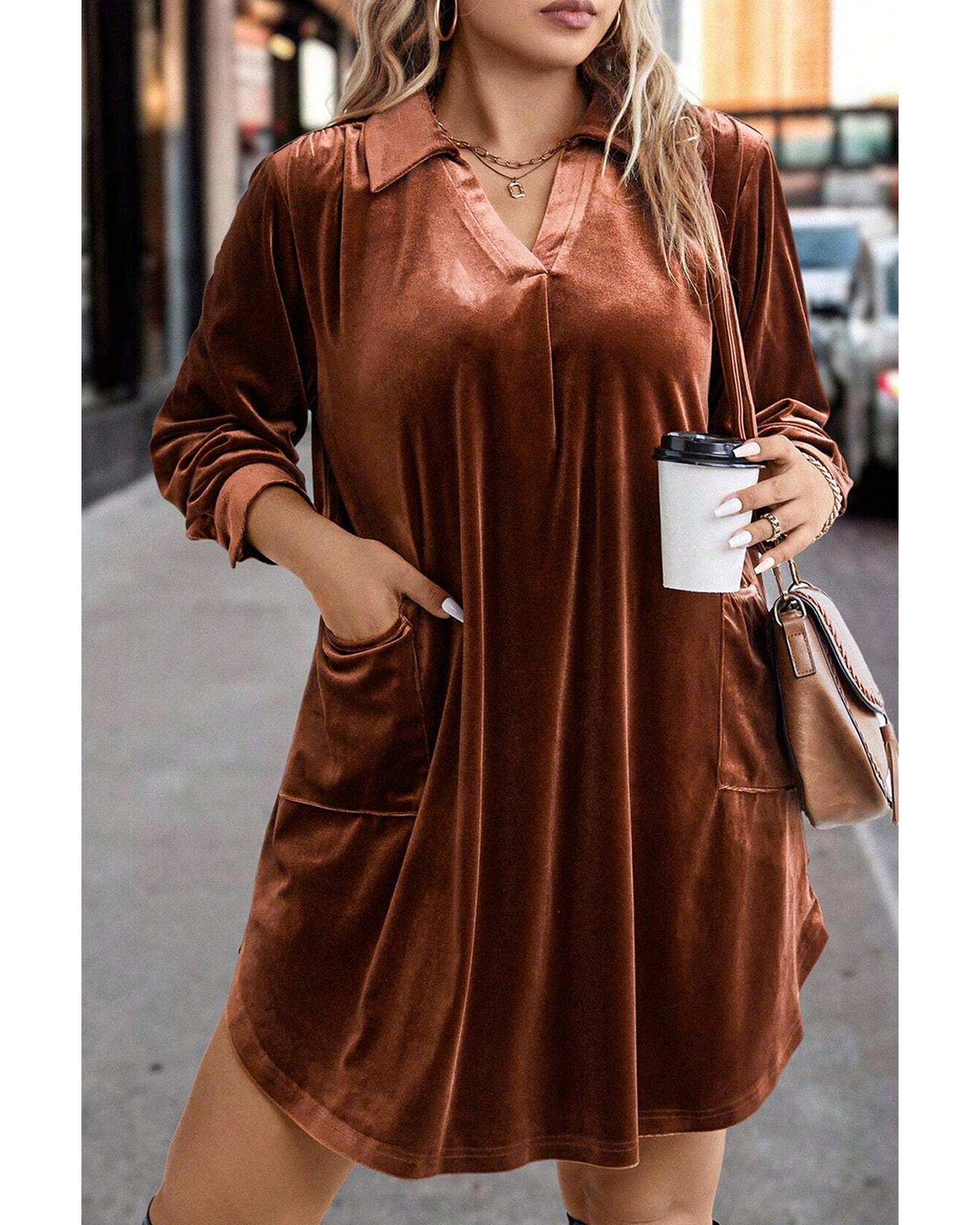 Coffee Plus Size V Neck Collared Pleated Back Rounded Hem Velvet Dress – 4X