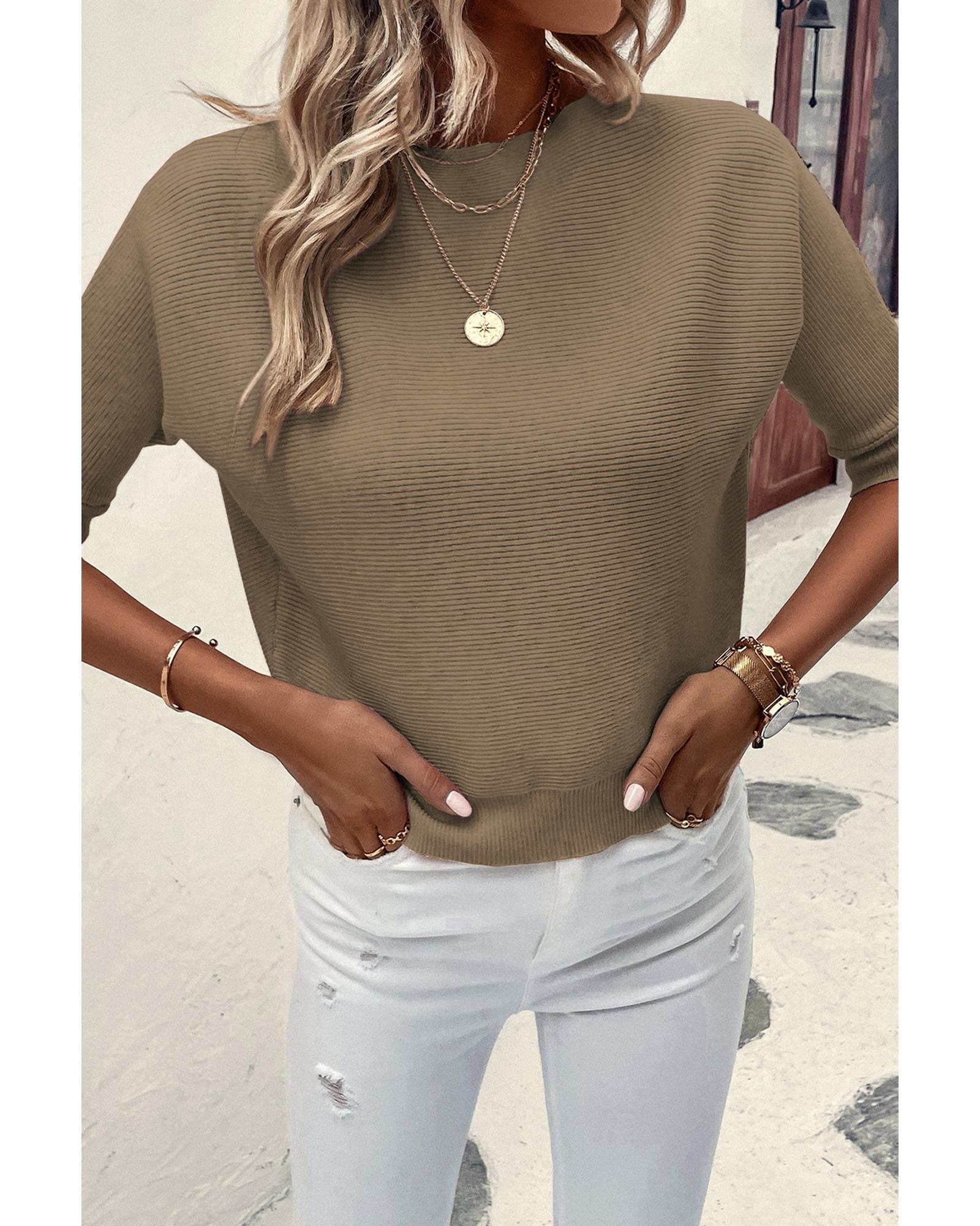 This ribbed knit top features a classic round neckline and half sleeves, offering a timeless and elegant look. Its versatile design makes it suitable for various occasions, combining style and comfort effortlessly.