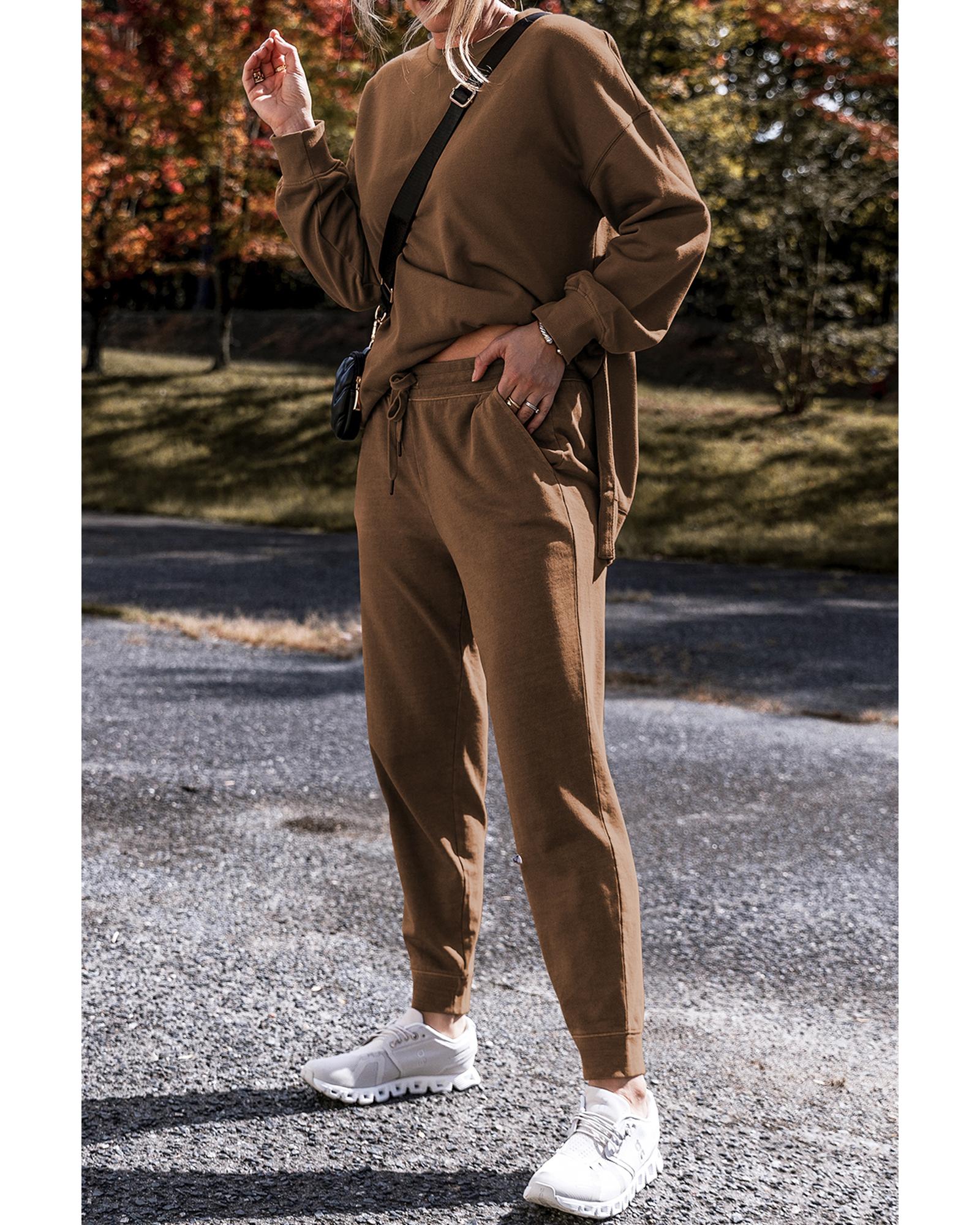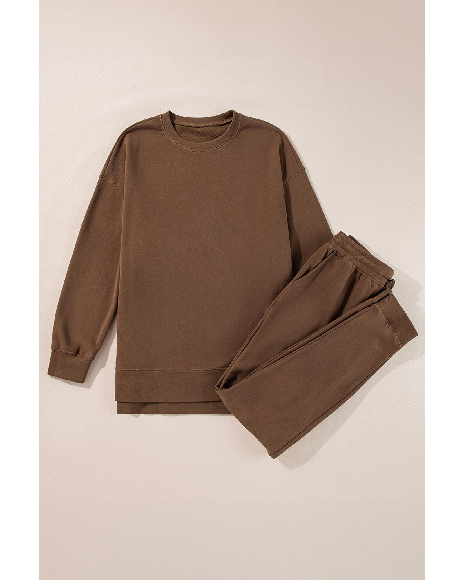 This high-low pullover and skinny pants set features a stylish and comfortable design in a solid coffee color. Crafted from a blend of polyester and cotton, it offers a versatile look suitable for casual outings and workouts. The set combines a loose-fitting crew neck sweatshirt with slim-fit pants, providing a trendy and flattering silhouette.