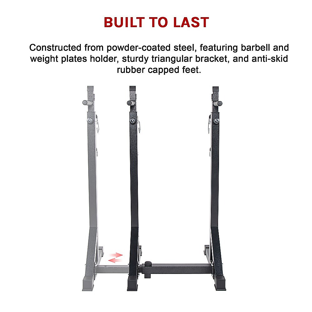 This adjustable squat rack is designed for athletes and fitness enthusiasts to enhance their weight training routines. It provides a sturdy and reliable support for barbell exercises, helping to prevent injuries and promote strength development. The stand features adjustable height settings to accommodate different workout needs and preferences, ensuring a safe and effective training experience.