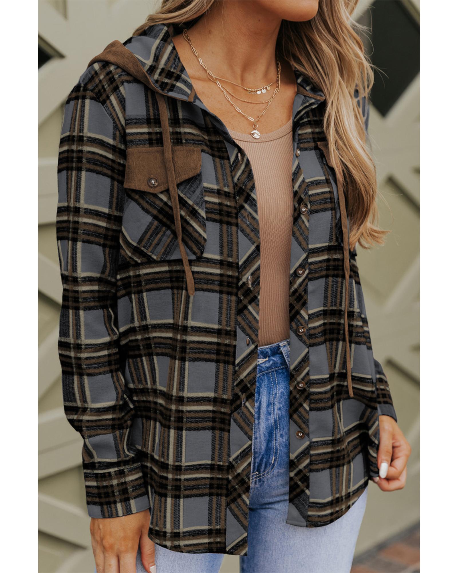 - Versatile contrast hooded shacket with a classic plaid pattern