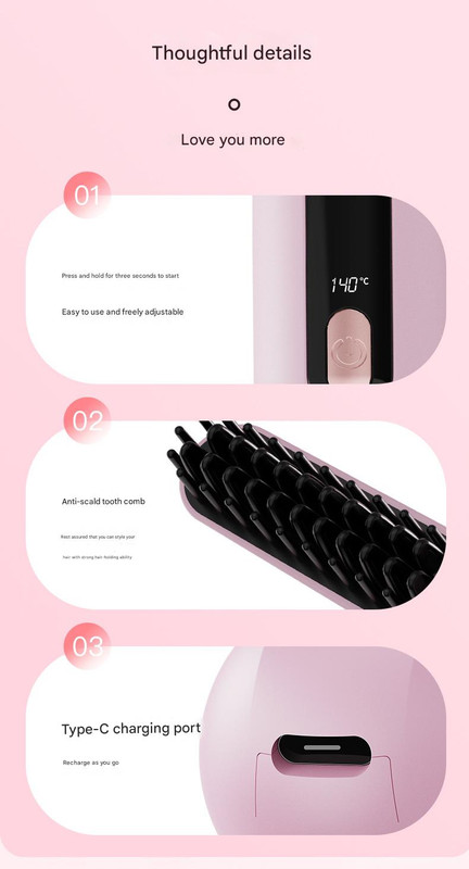 This cordless hair straightener brush offers a convenient and portable solution for styling hair anytime and anywhere. It features a powerful rechargeable battery, multiple temperature settings, and a safety-focused 3D comb design, making it suitable for various hair types and on-the-go use.