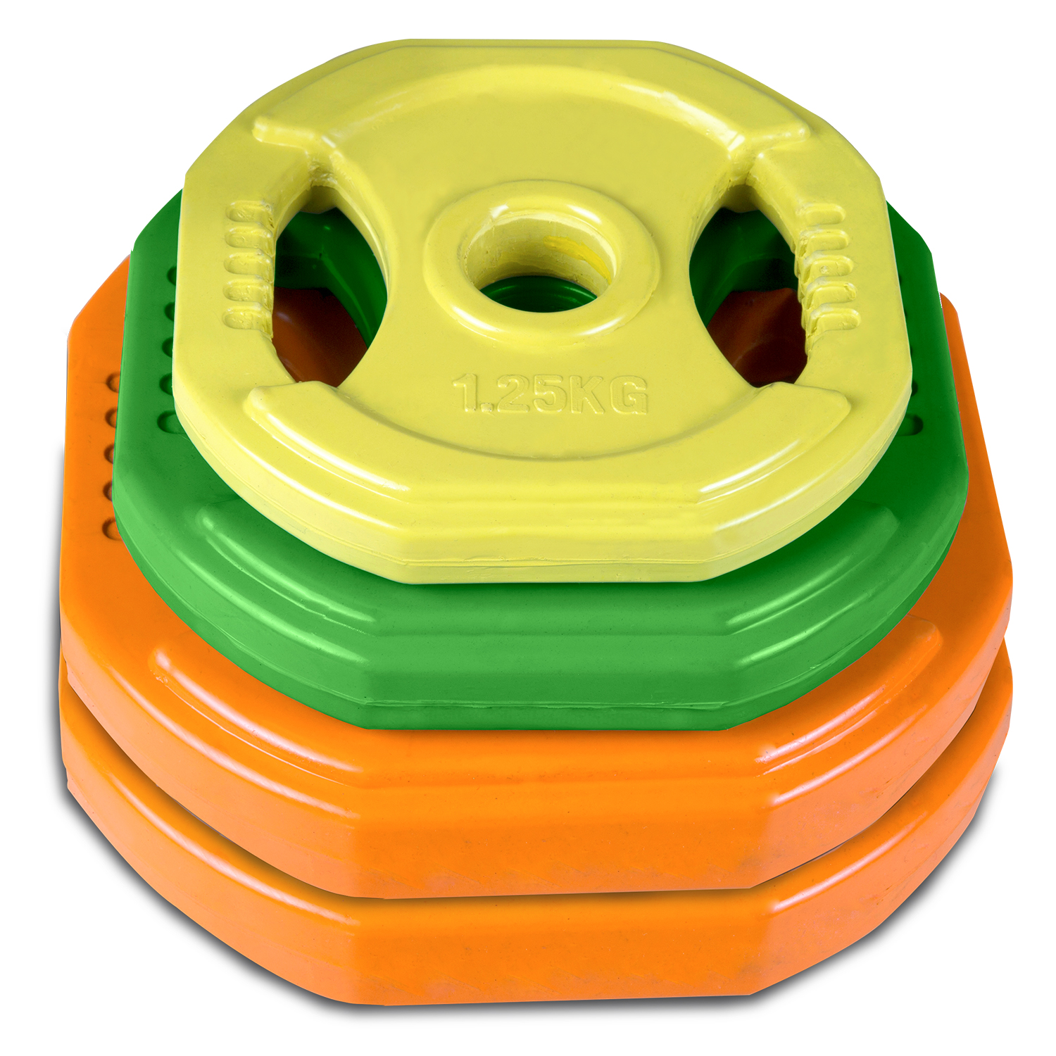 This 30kg weight set is ideal for home workouts, gym training, studio classes, and aerobics. The plates feature an anti-roll design and are rubber-coated, making them suitable for all surfaces and helping to protect flooring.