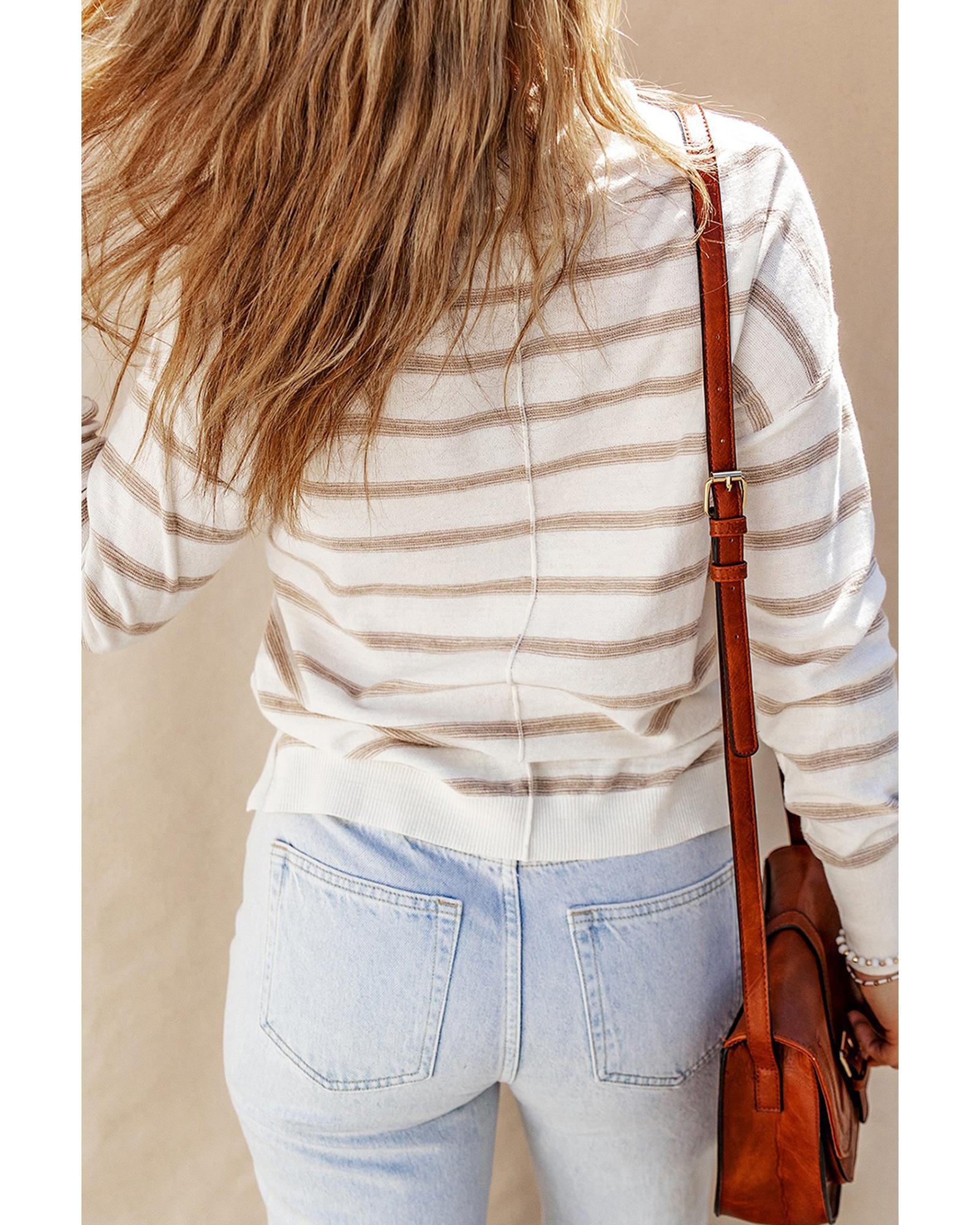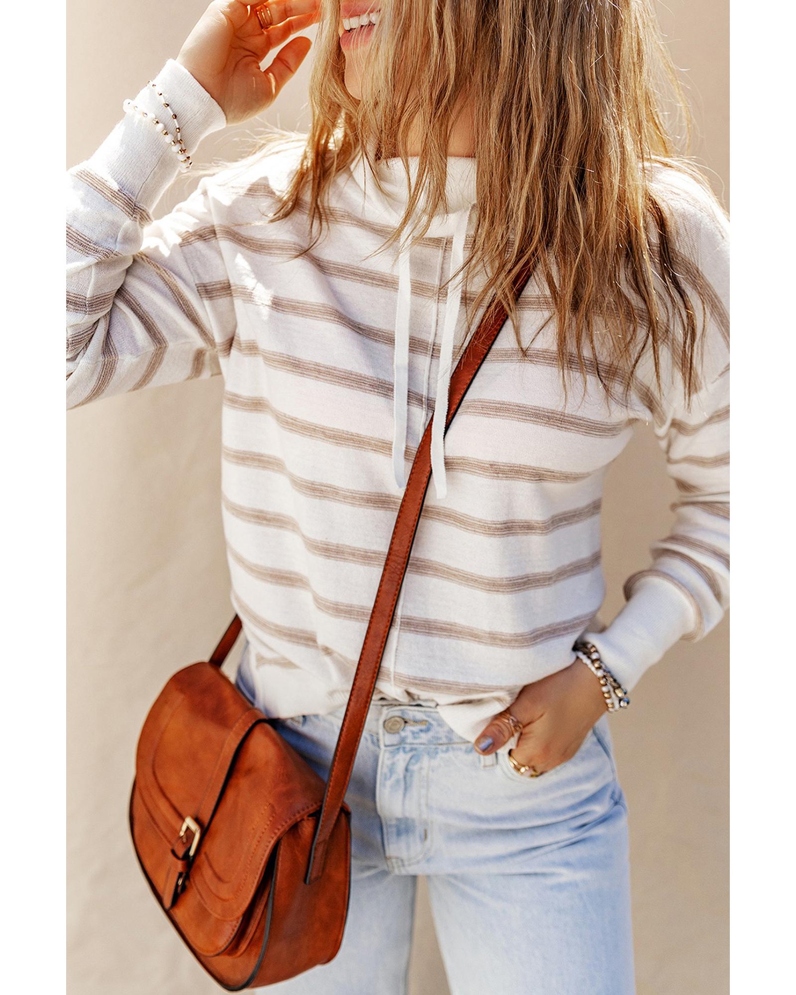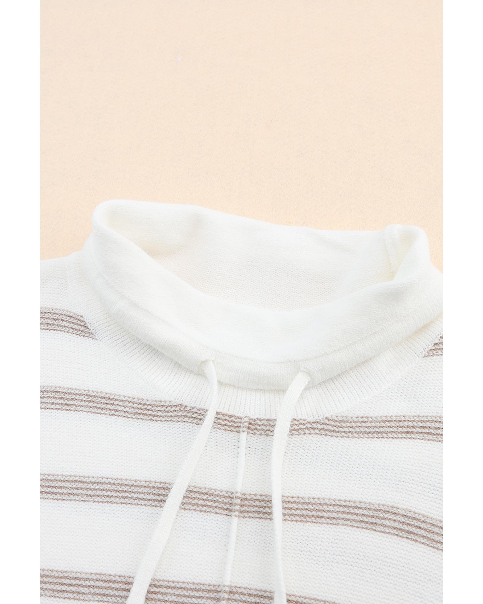 This sweater features a stylish cowl neck design combined with a classic striped print, offering a trendy and relaxed look. Its drop shoulder style provides a comfortable fit, making it ideal for layering and staying warm during colder months.