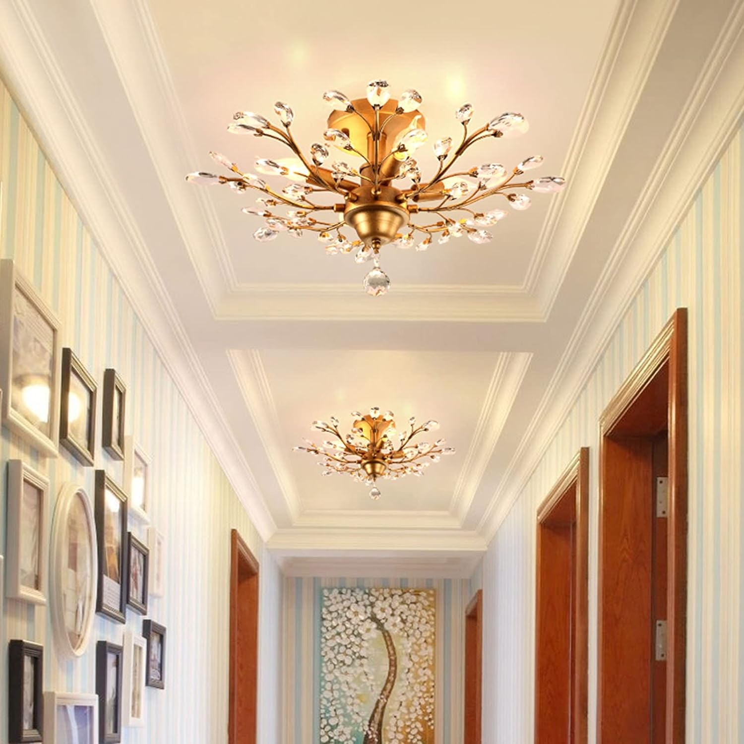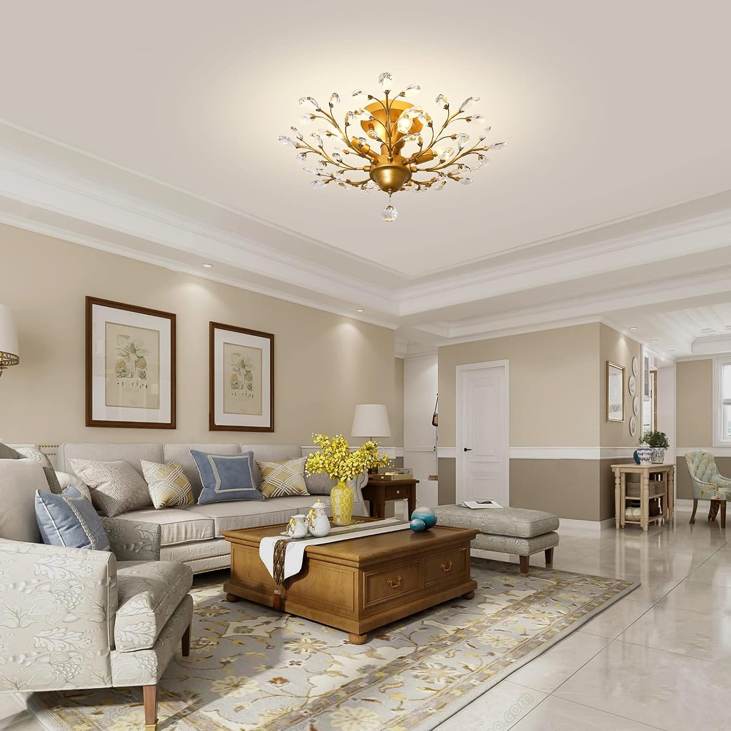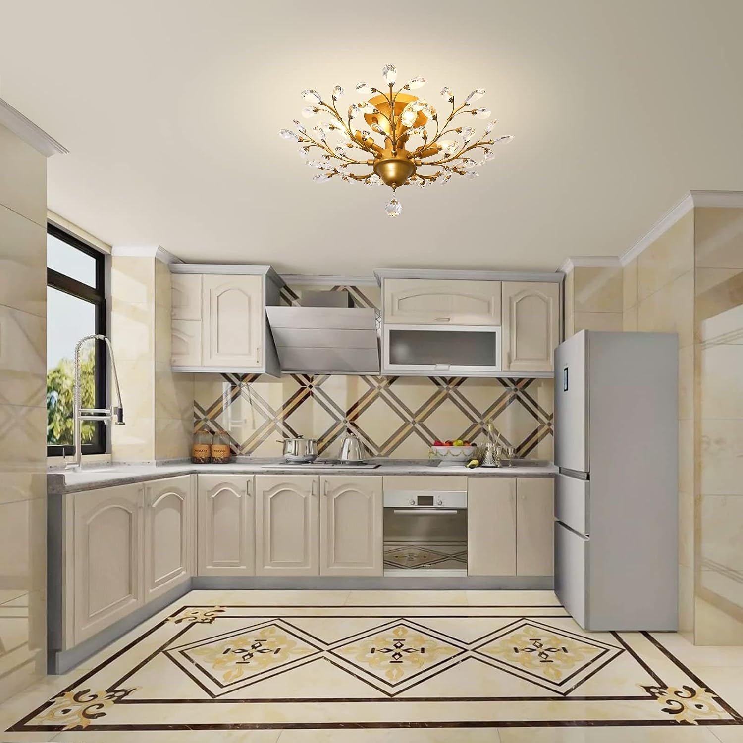 This vintage-style crystal chandelier features a 4-light design with a gold finish, adding an elegant touch to various interior spaces. It is designed to provide a warm, reflective glow with its transparent K9 crystals, creating a romantic and inviting atmosphere. Suitable for different rooms, it combines classic aesthetics with versatile functionality.