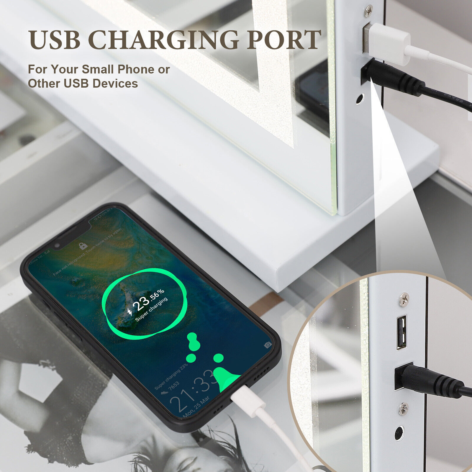 This vanity mirror features a luxurious and multi-functional design, incorporating a crystal light strip for elegant illumination. It includes a built-in Bluetooth speaker for music playback and a USB charging port to power your devices during use. The mirror offers customizable lighting with three adjustable modes and dimmable brightness, providing ideal lighting conditions for makeup application. It is versatile in placement, with a detachable base for tabletop use or wall mounting, making it suitable for various room setups.