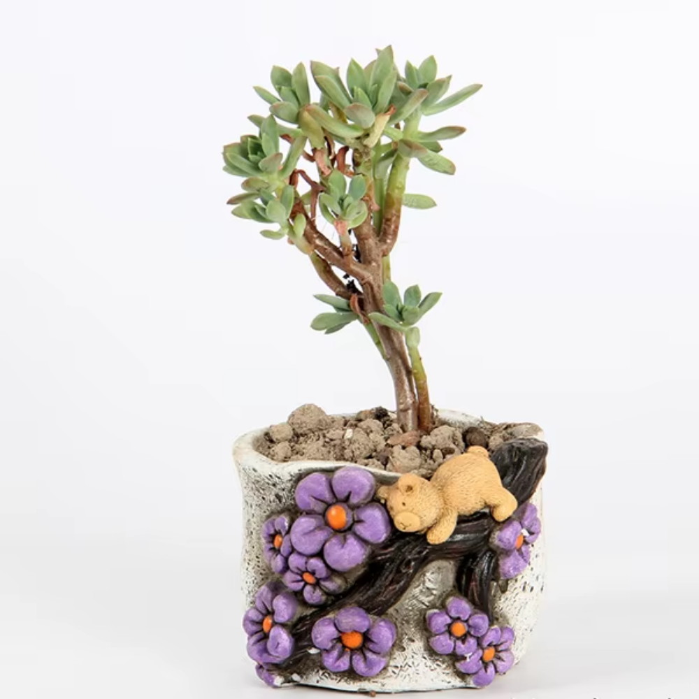 This charming hand-painted bear succulent pot features a cute and whimsical design, perfect for adding a touch of joy to your space. Made from cement, it is hand-cast and painted, with a drainage hole to ensure healthy plant growth. Suitable for succulents or bonsai, it offers a versatile and delightful decorative option.
