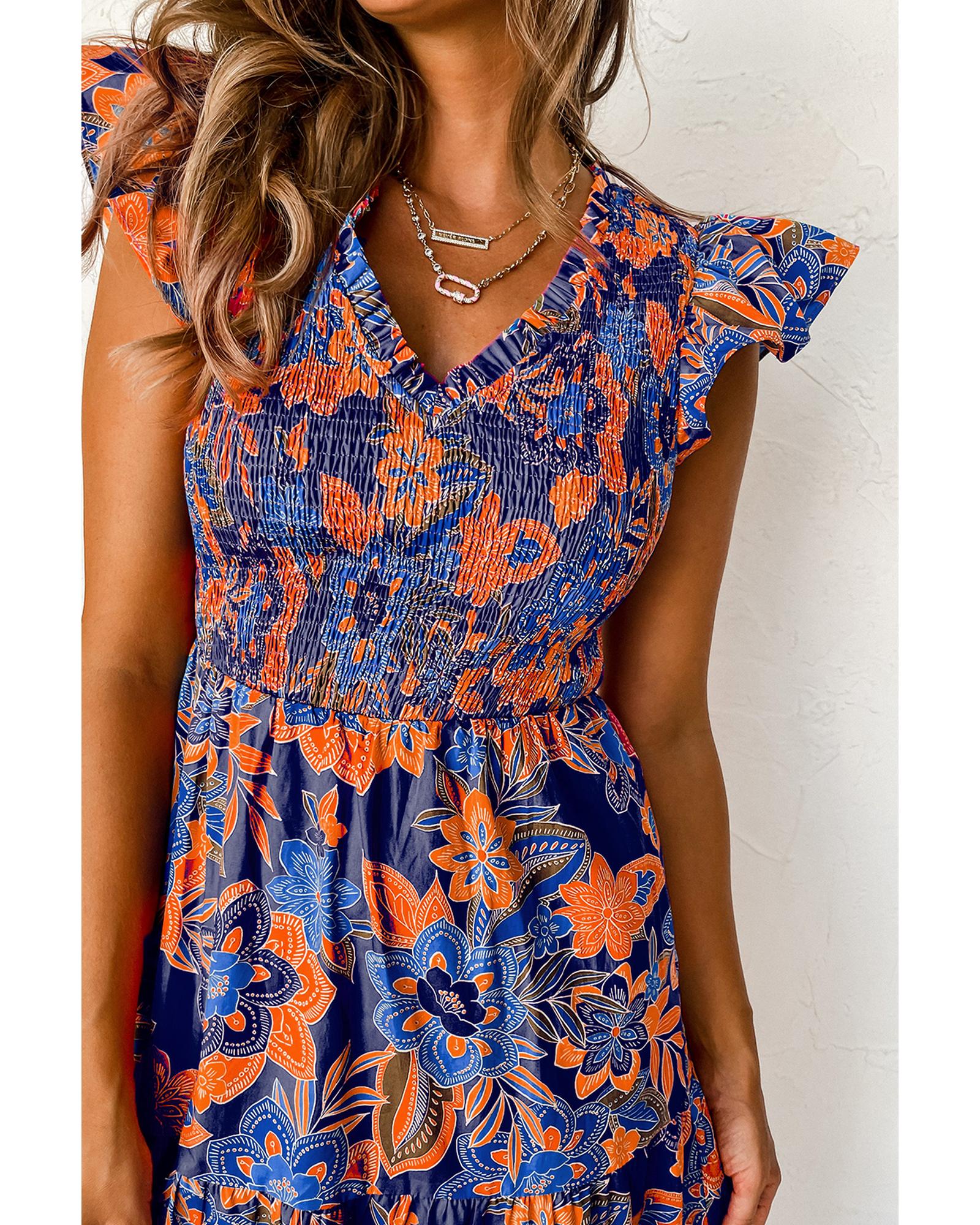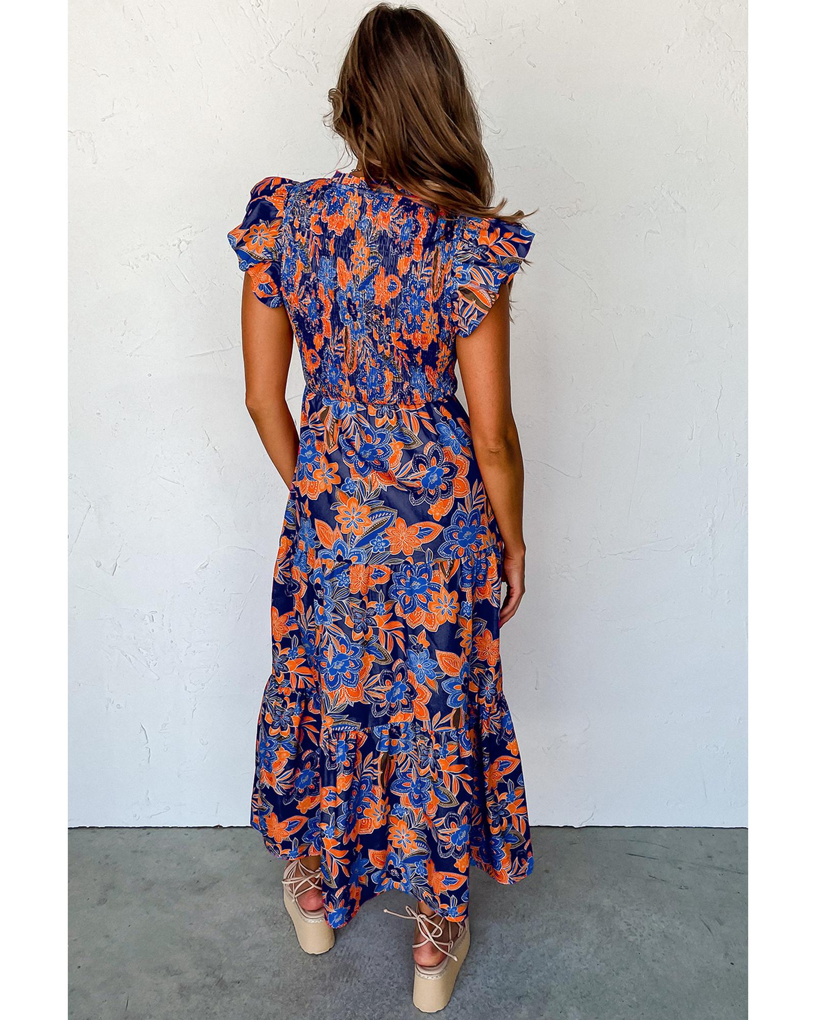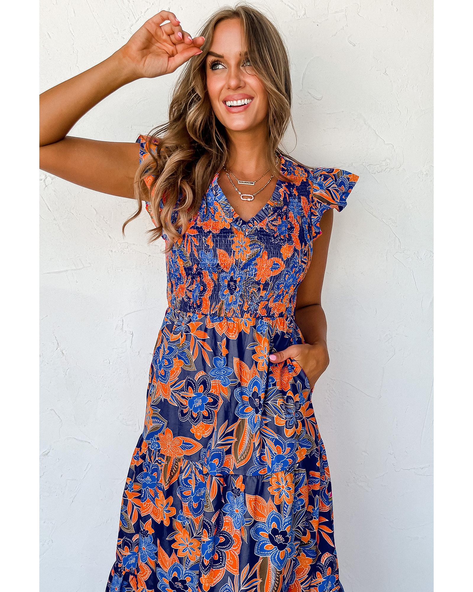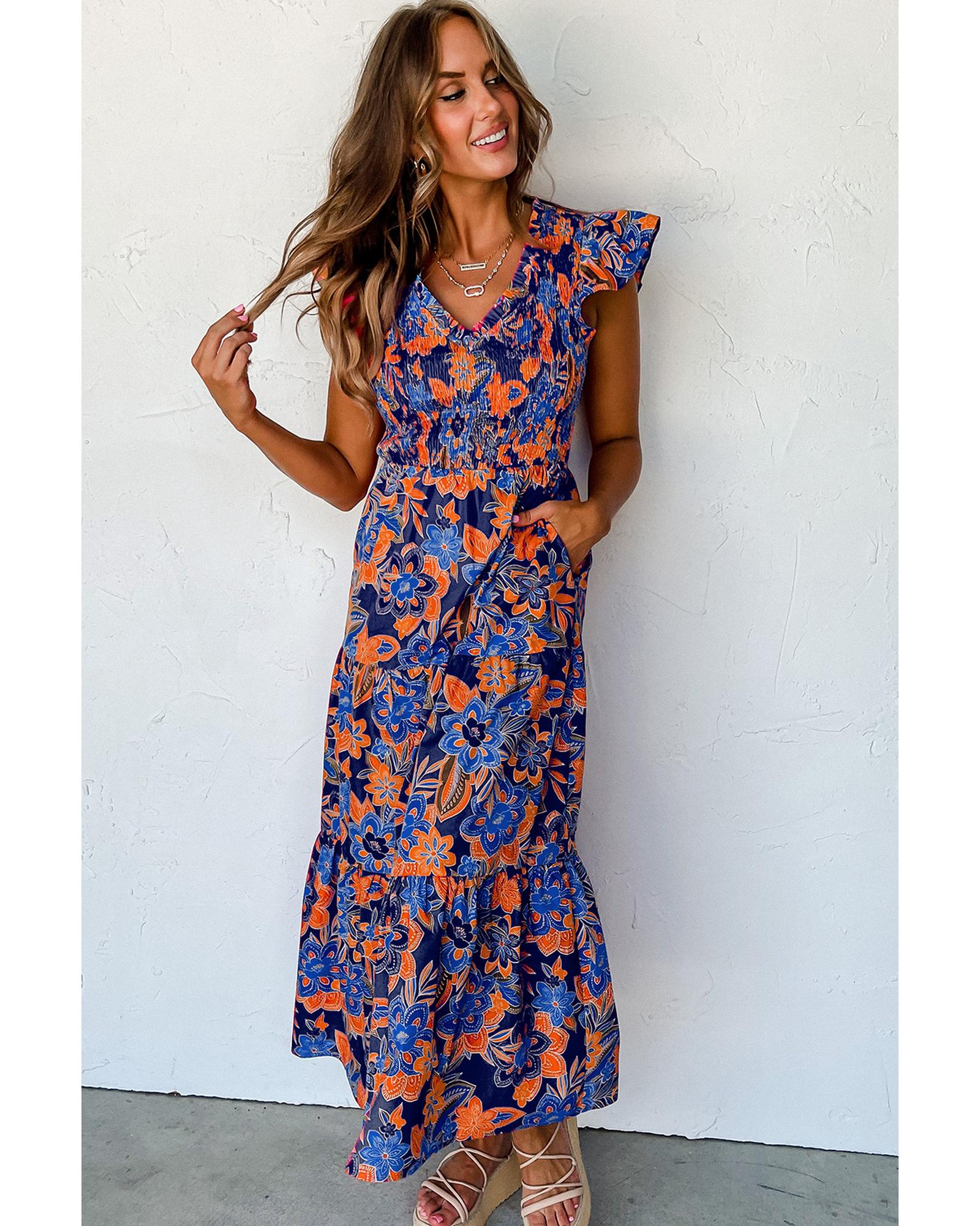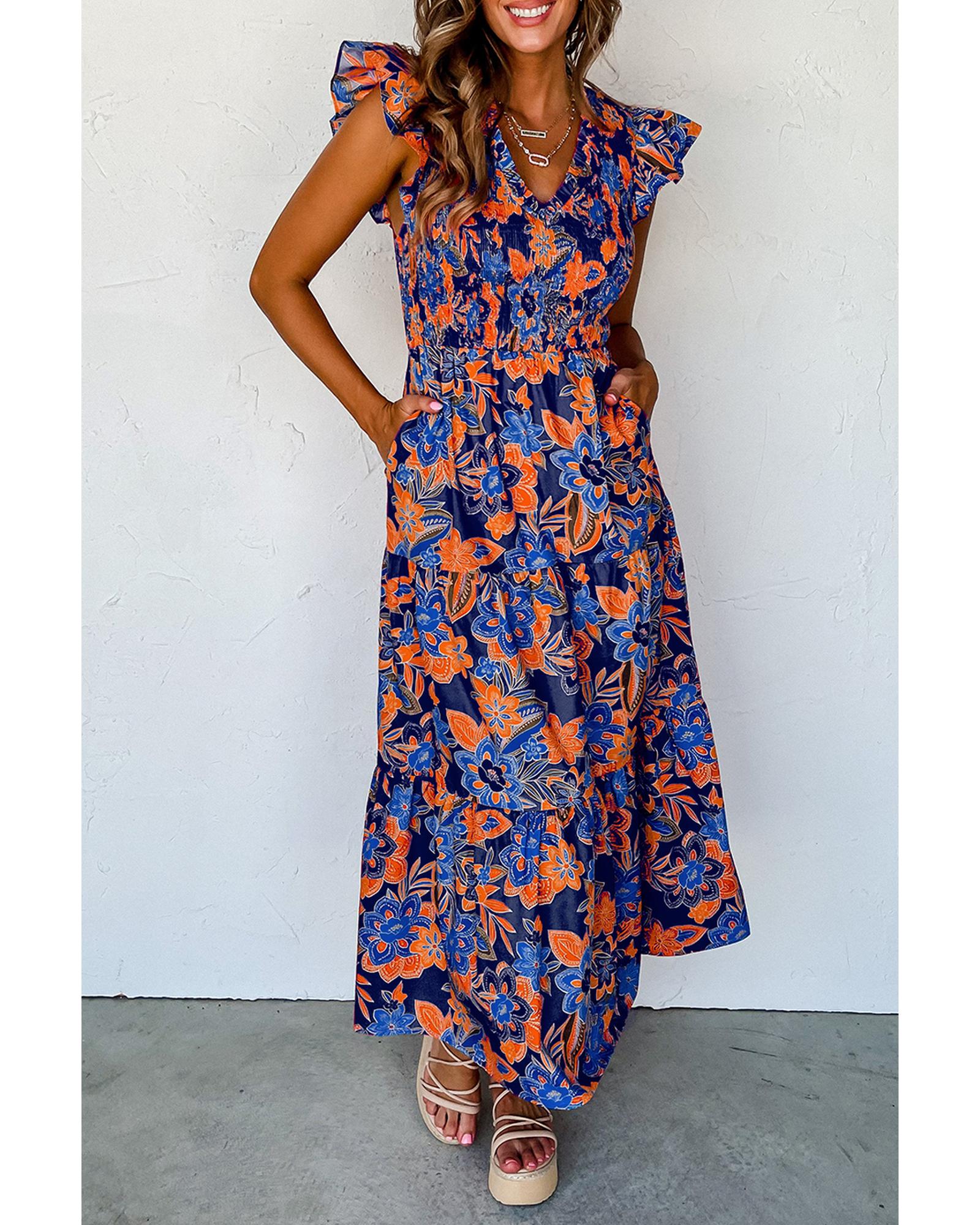 This dark blue boho floral long dress features a V neckline with ruffles and frilled sleeves, offering a trendy and fitted look. The smocked bodice and tiered A-line silhouette make it suitable for summer garden parties and date nights, combining style and comfort.