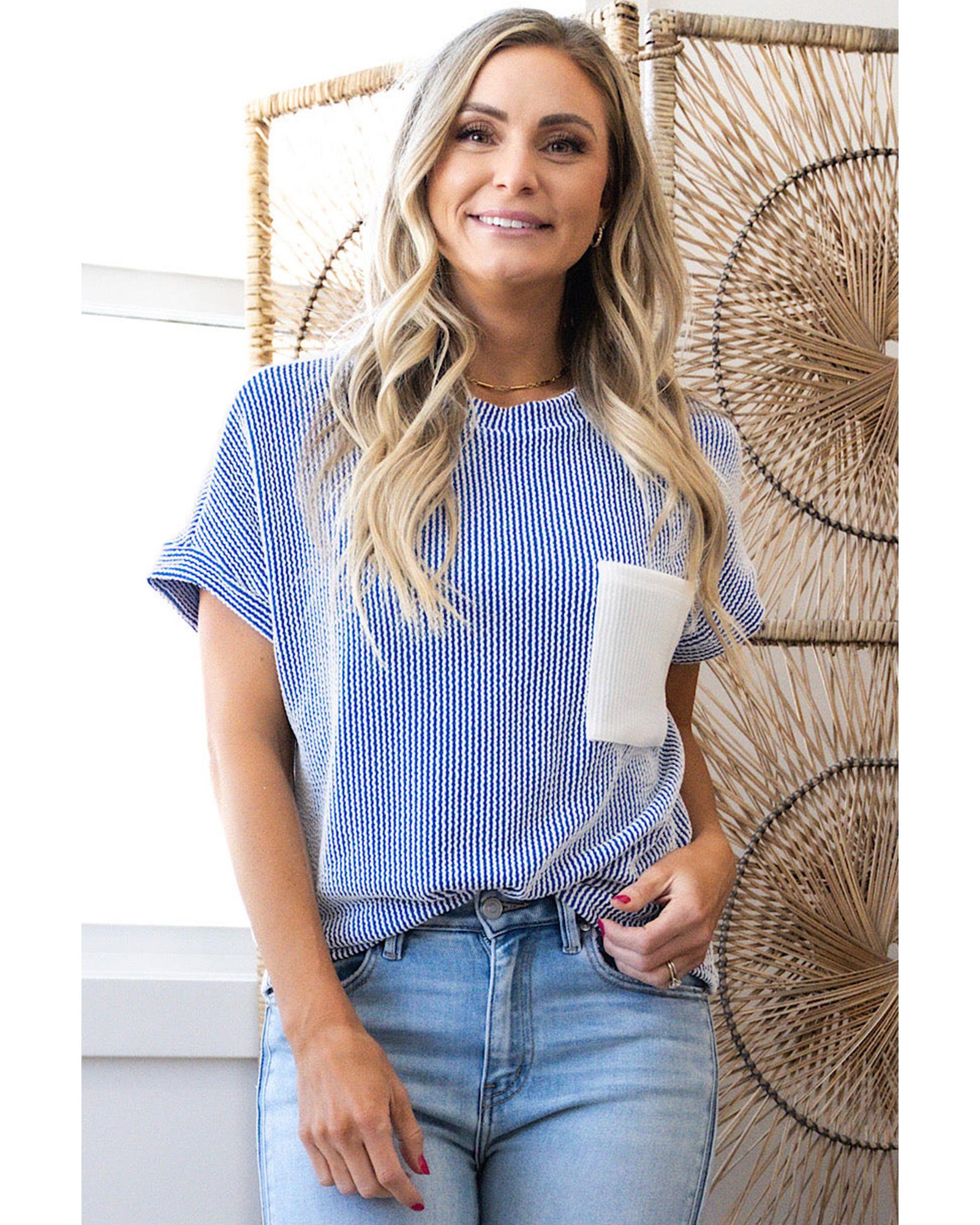 This dark blue corded knit T-shirt features a color block design with a practical chest pocket. It offers a comfortable fit with a classic crew neck and is suitable for pairing with various pants and shorts. The fabric is soft and breathable, making it ideal for everyday wear.