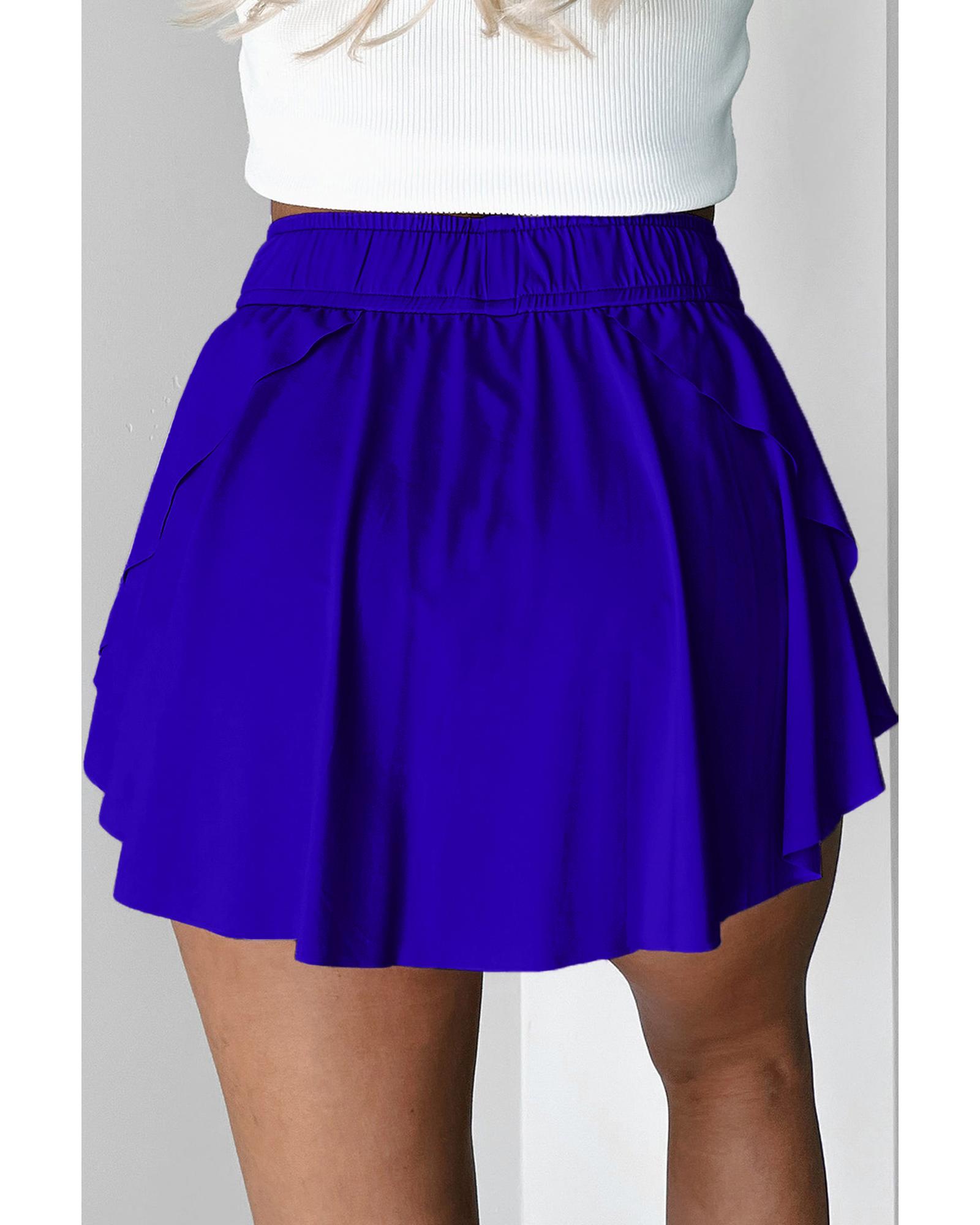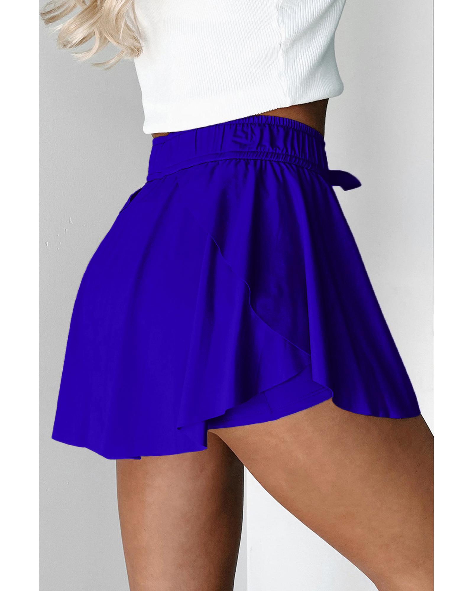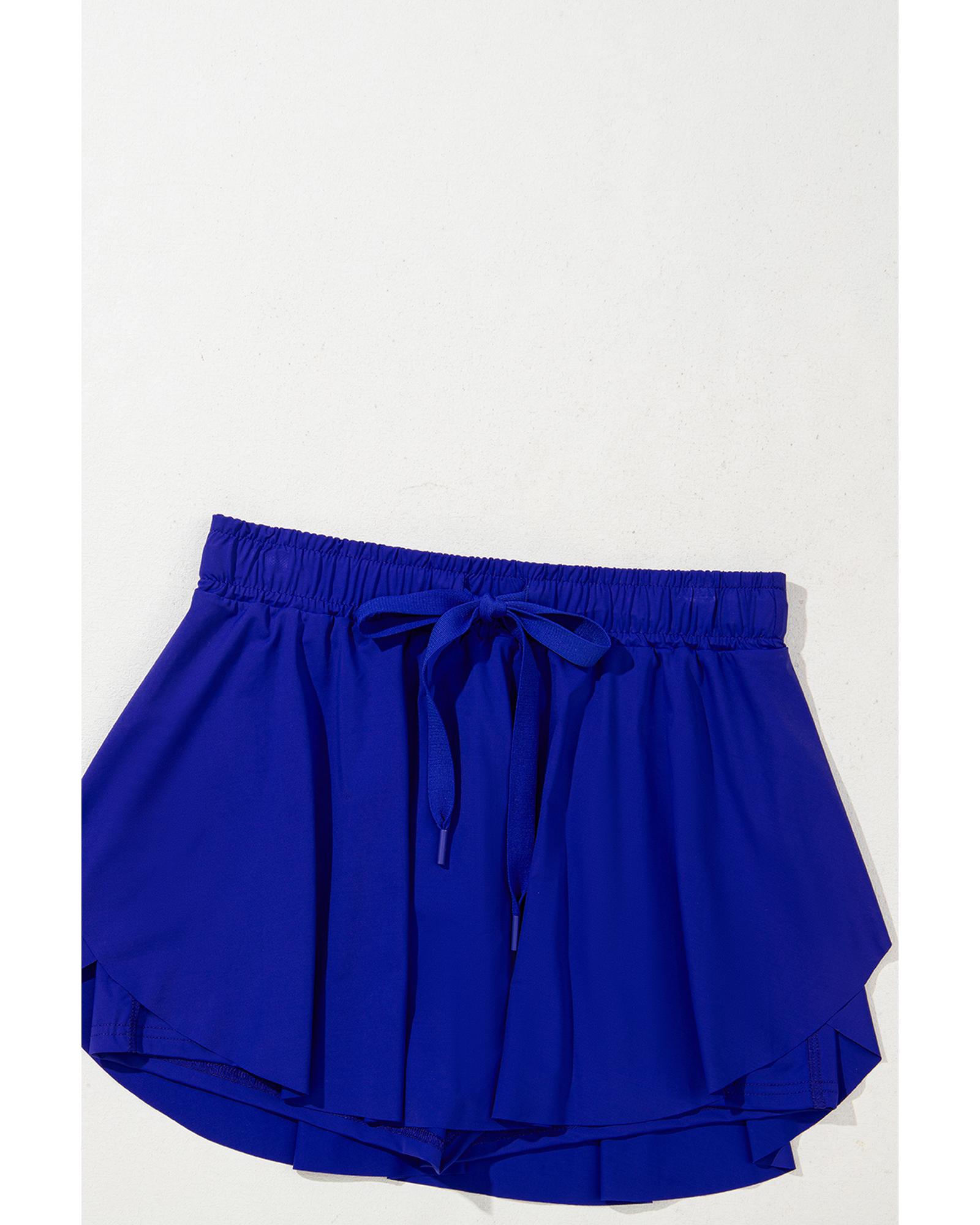This pair of dark blue tennis skorts features a high waist design that offers a stylish and flattering silhouette. The built-in lining provides additional support and coverage, making them suitable for various sports activities. The adjustable drawstring closure ensures a comfortable and flexible fit, ideal for active wear.