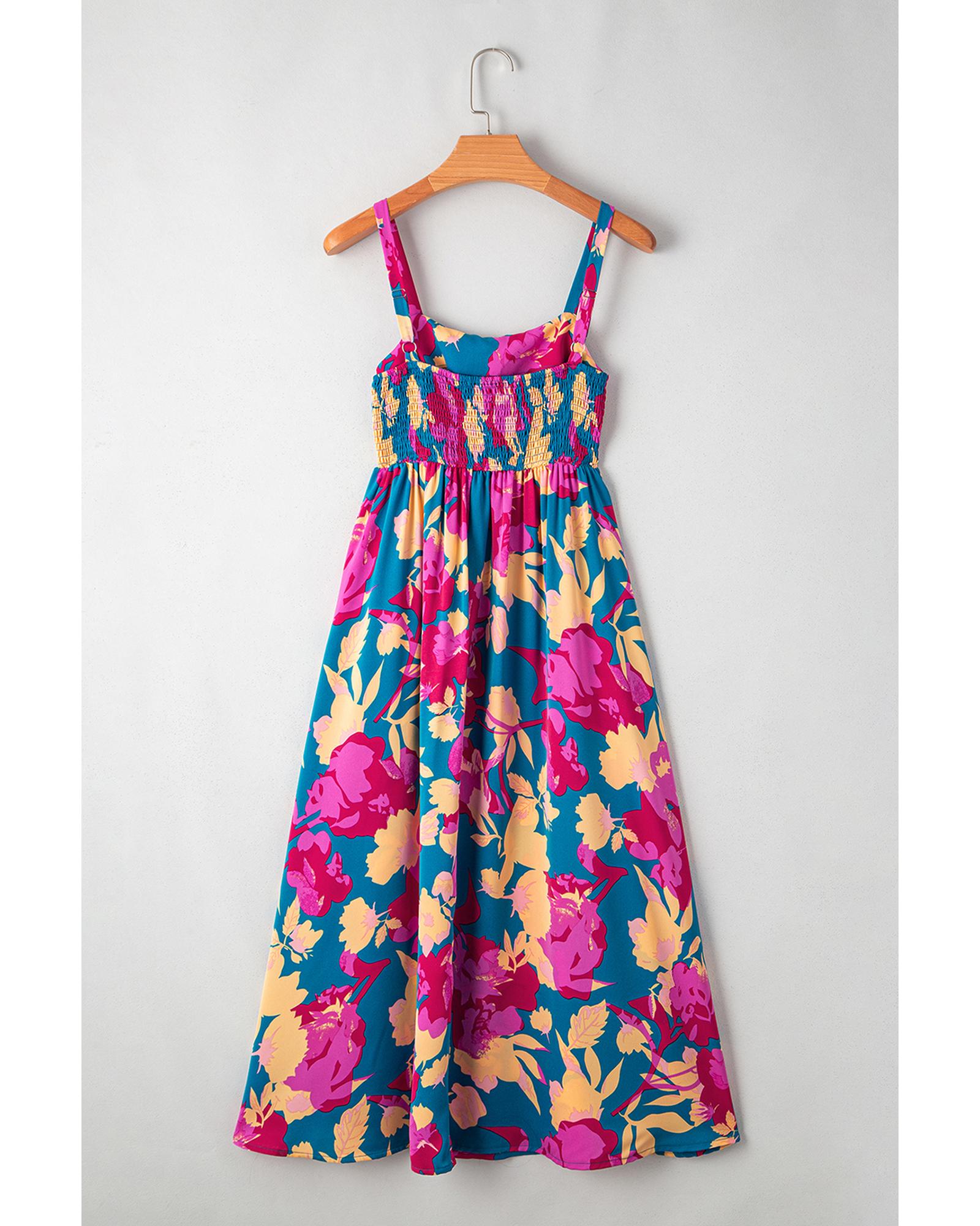 This elegant dark blue floral dress features a high waist design and a sleeveless style, offering a modern and breezy look. Its flared long silhouette and midi length make it suitable for various occasions, providing a flowy and graceful appearance.
