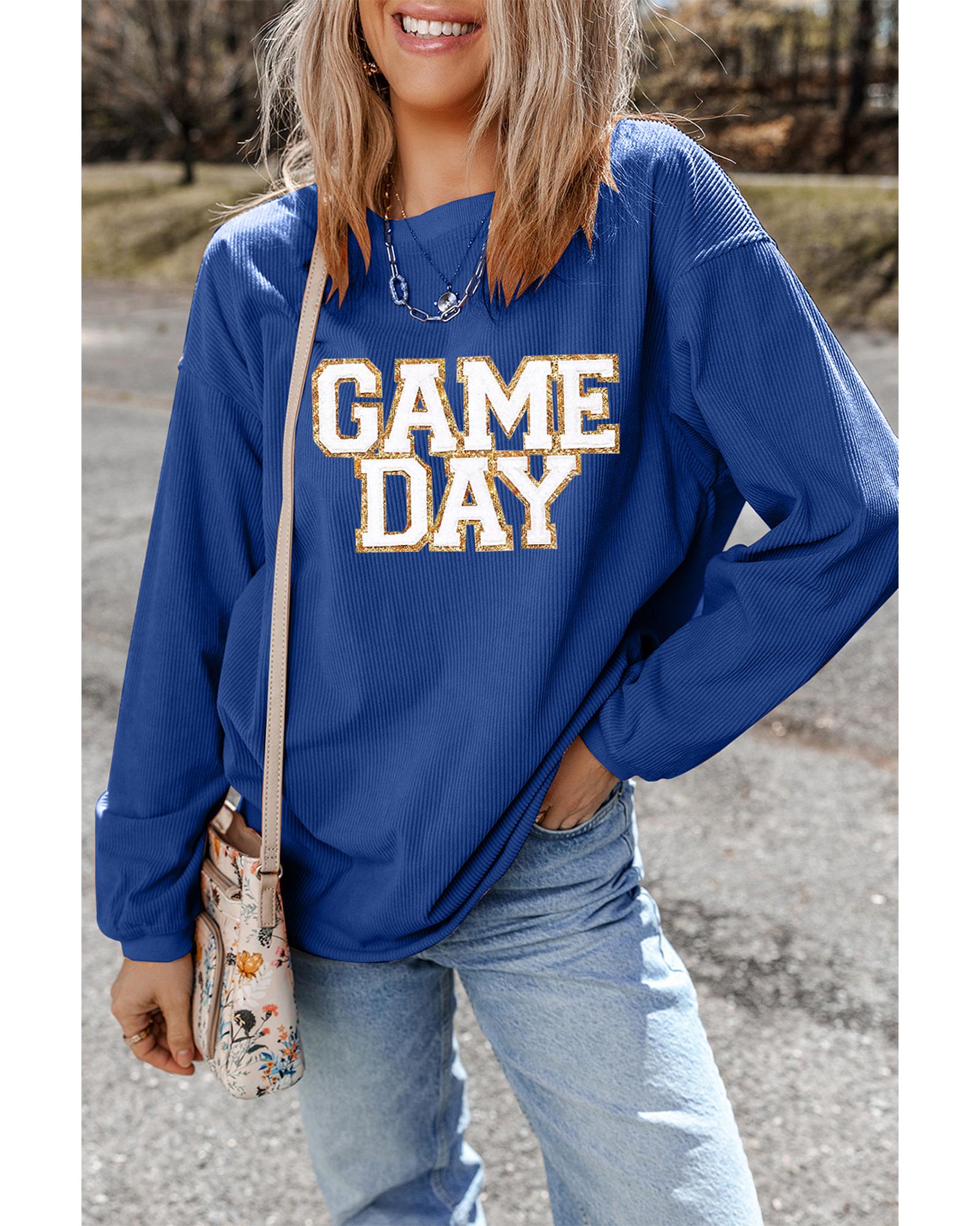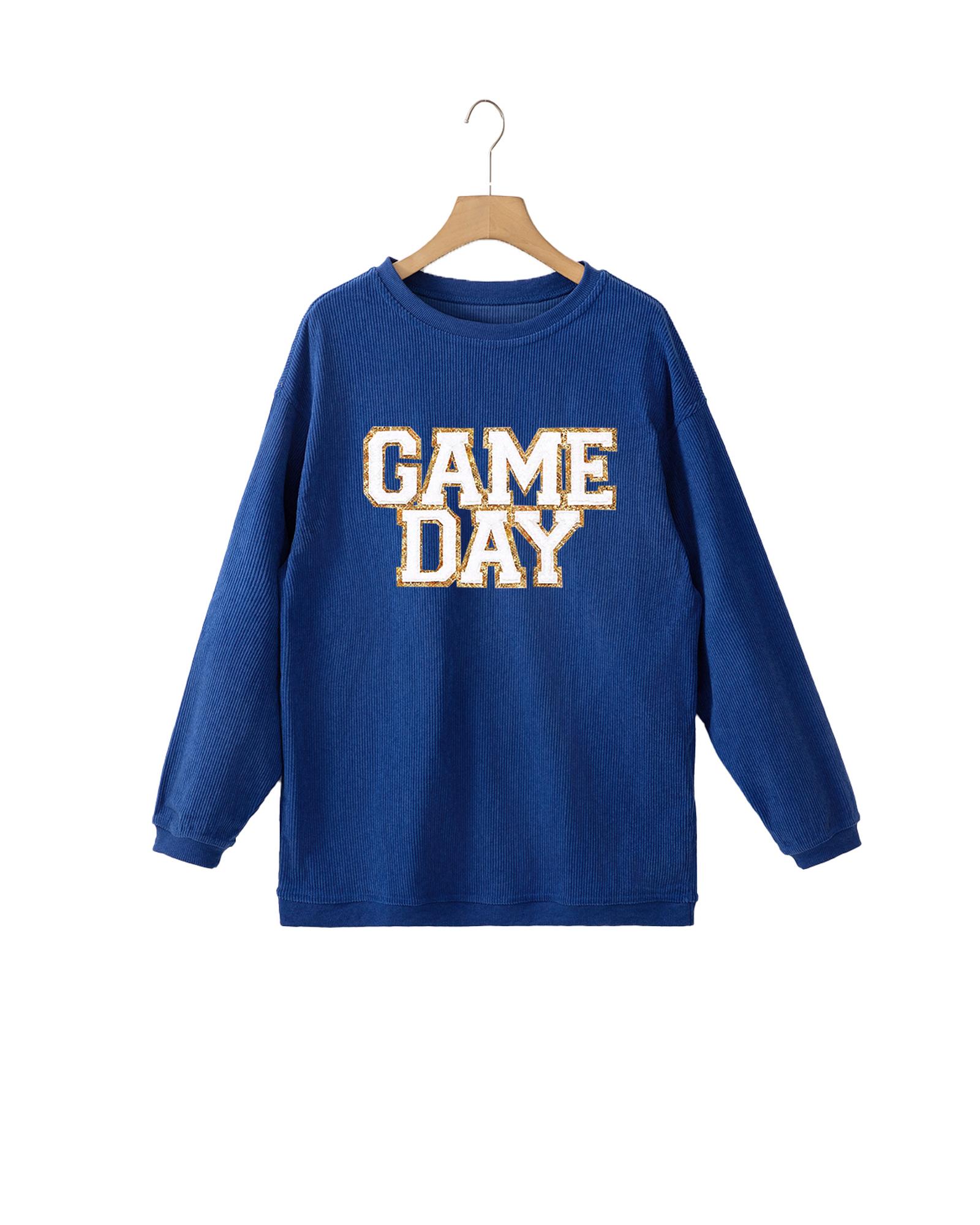 Dark Blue GAME DAY Glitter Detail Ribbed Drop Shoulder Sweatshirt – L