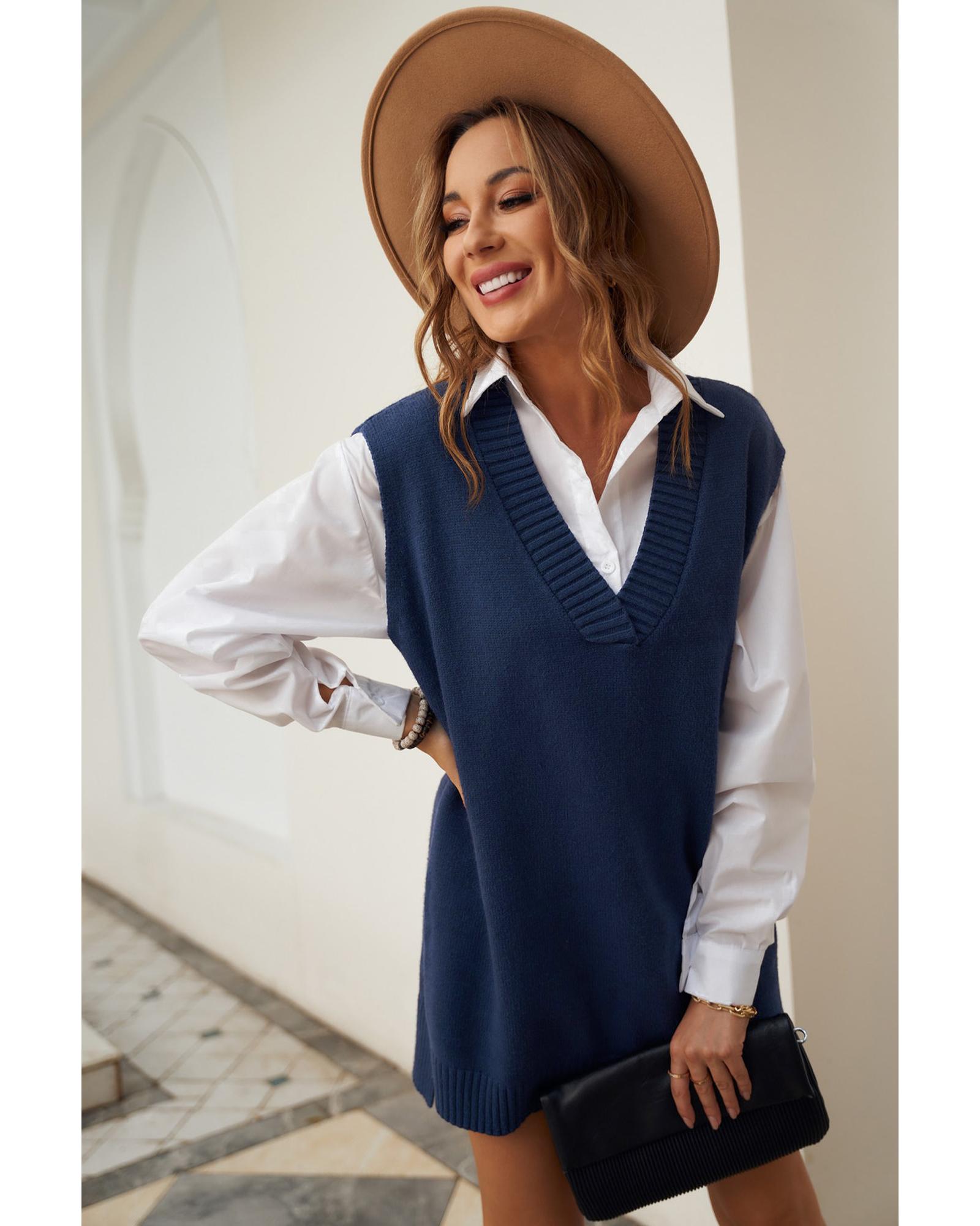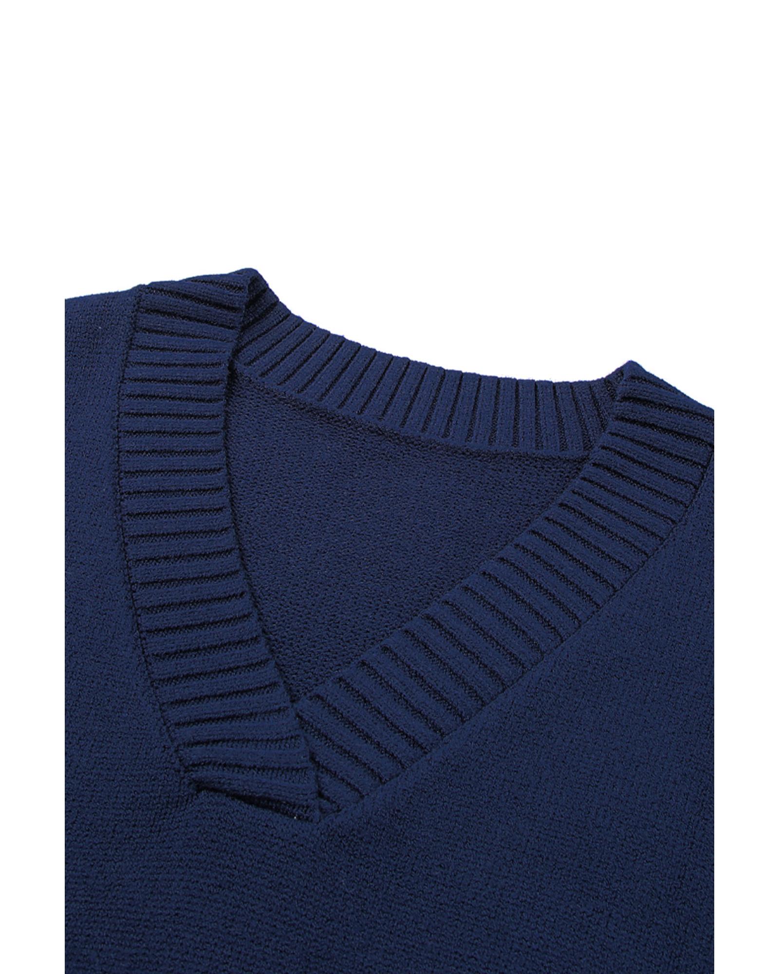 This dark blue knit vest pullover sweater offers a stylish and comfortable option for various occasions. Designed with a trendy fitted look, it combines fashion with warmth, making it suitable for both casual and formal wear.