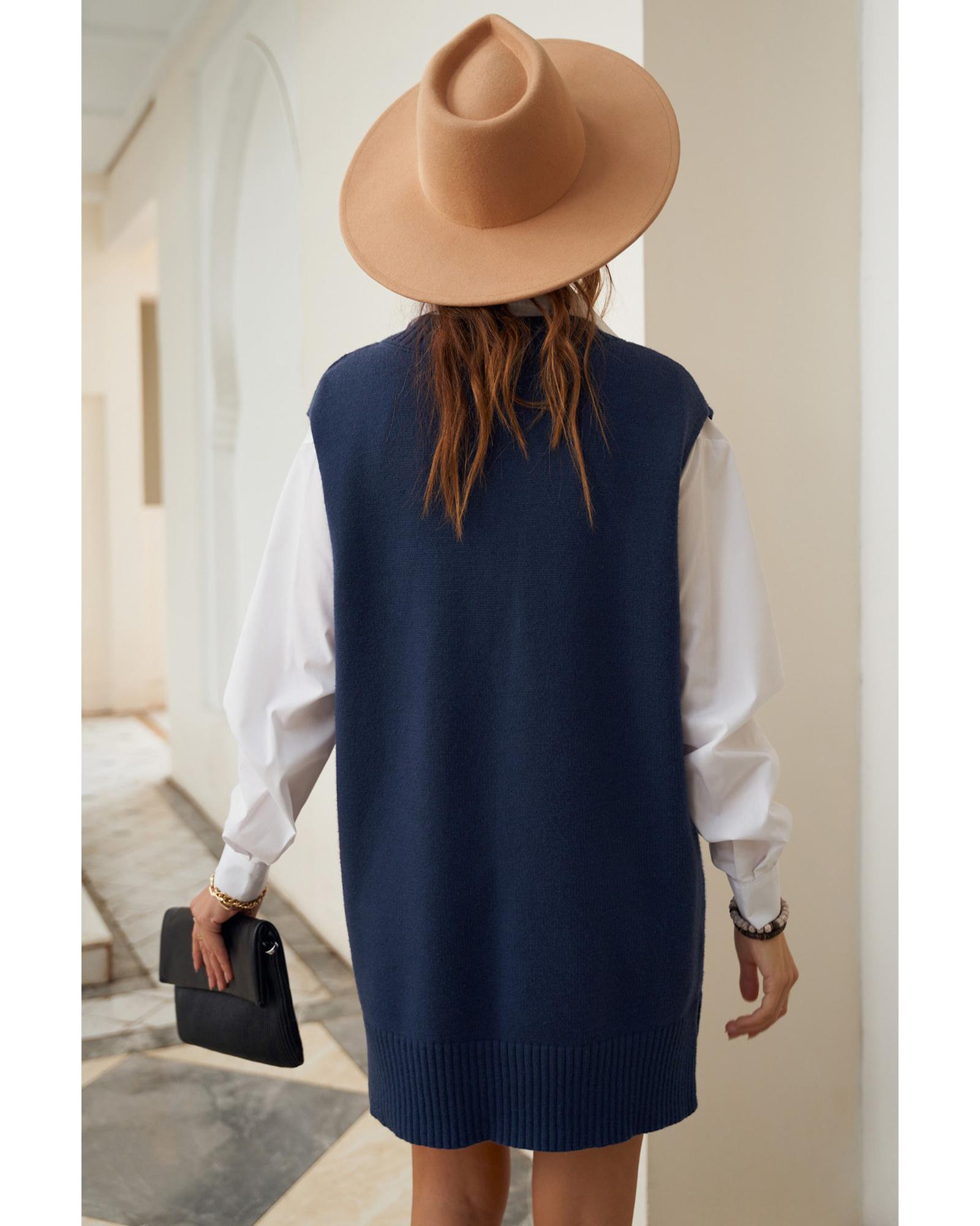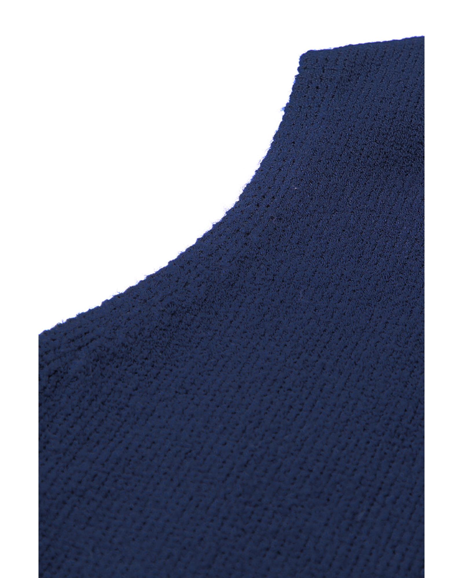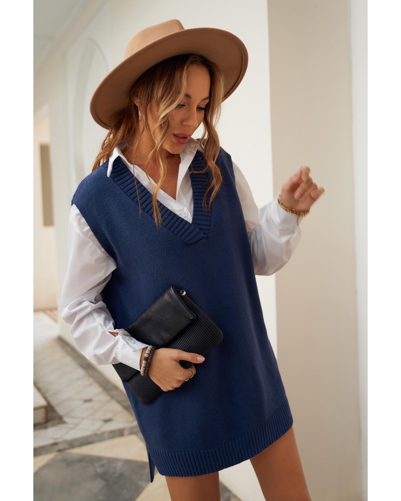 This dark blue knit vest pullover sweater offers a stylish and comfortable option for various occasions. Designed with a trendy fitted look, it combines fashion with warmth, making it suitable for both casual and formal settings.