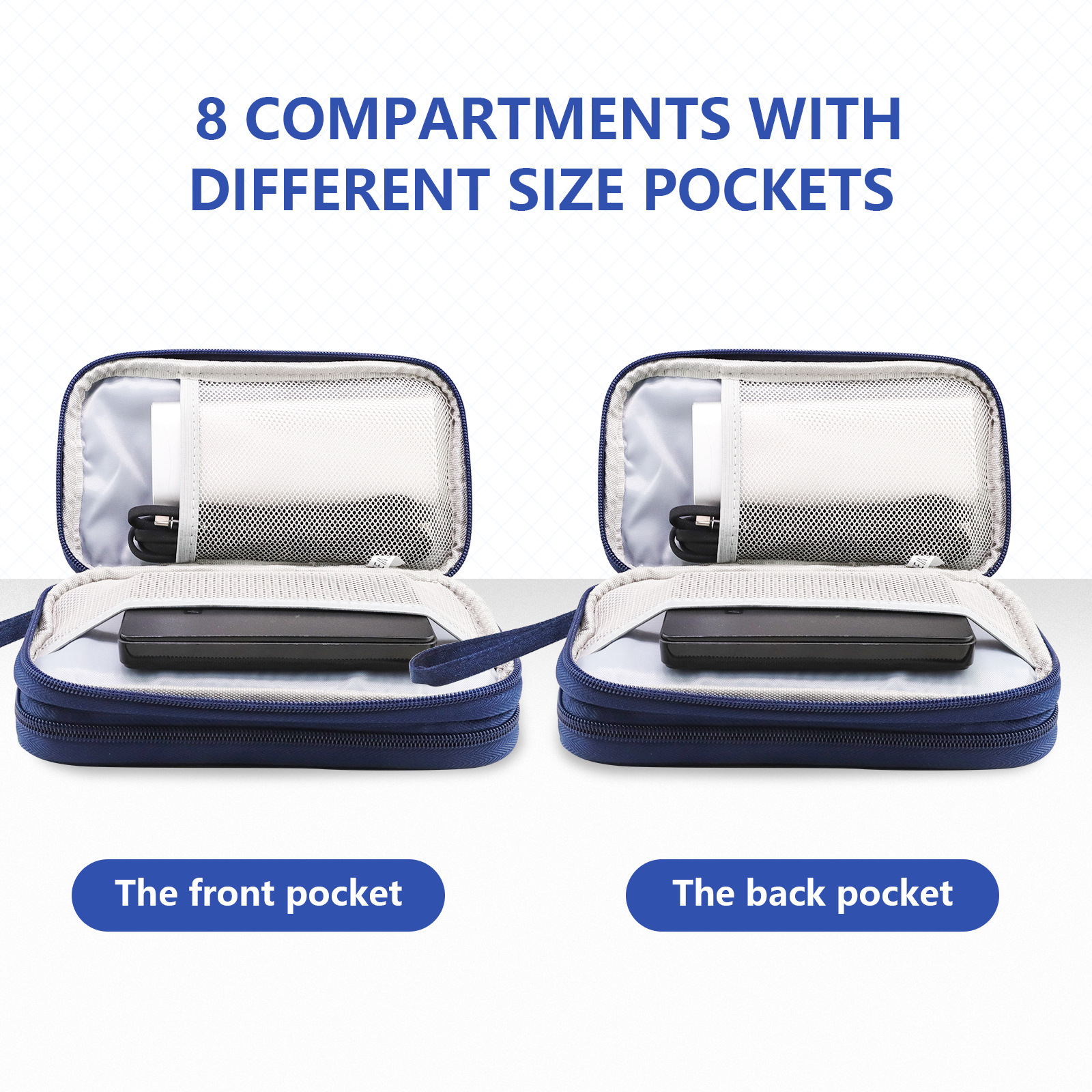 - Multiple compartments for power banks, cables, earphones, and USB drives