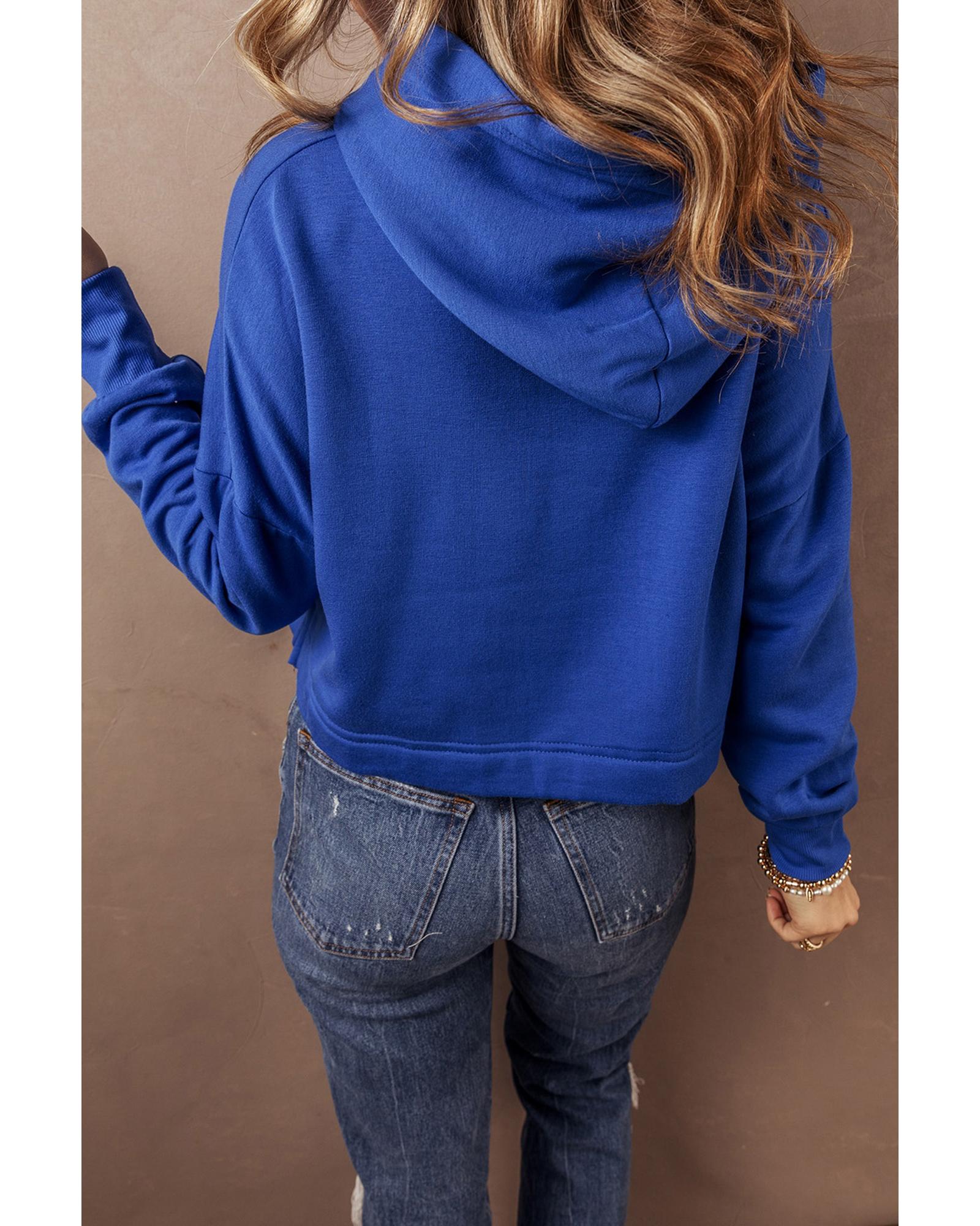 This dark blue cropped hoodie features a trendy drop shoulder design and an adjustable drawstring hood, offering a stylish and comfortable fit. Made from a blend of polyester and cotton, it provides quality and softness suitable for all genders.