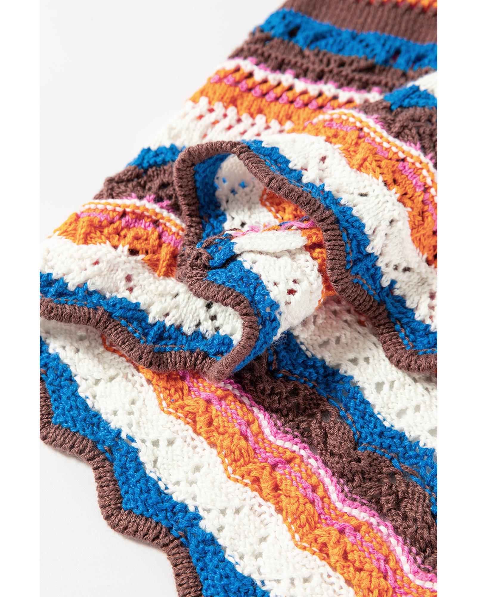 This dark blue striped textured knit crew neck sweater vest offers a stylish and versatile addition to your wardrobe. Designed with a trendy fitted look, it features a unique crochet pattern and a sleeveless design, making it suitable for layering and casual wear. The vibrant hues and bohemian touch add a playful element to your outfit, perfect for summer festivals or relaxed outings.