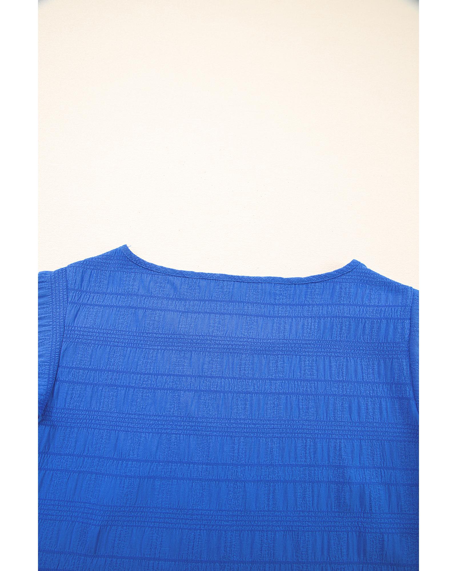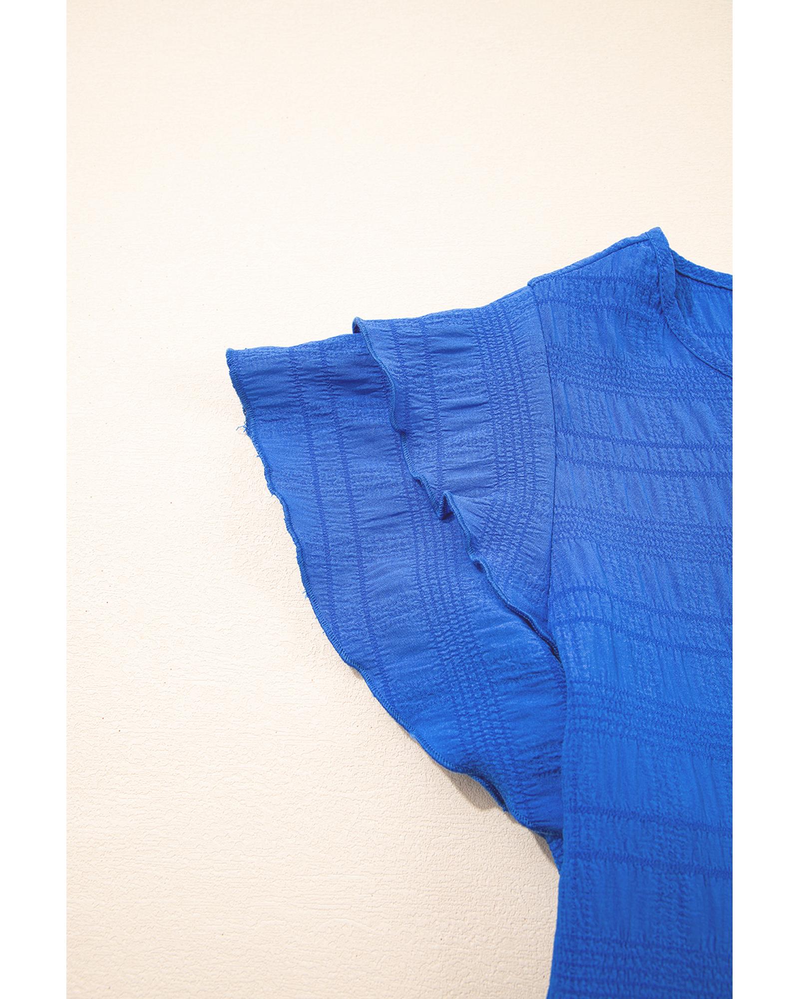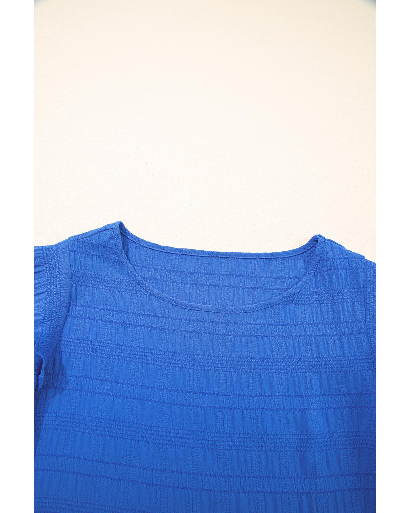 This dark blue textured top features a stylish ruffled sleeve design and a classic round neckline. It offers a flattering fit silhouette that is both fashionable and comfortable for everyday wear.