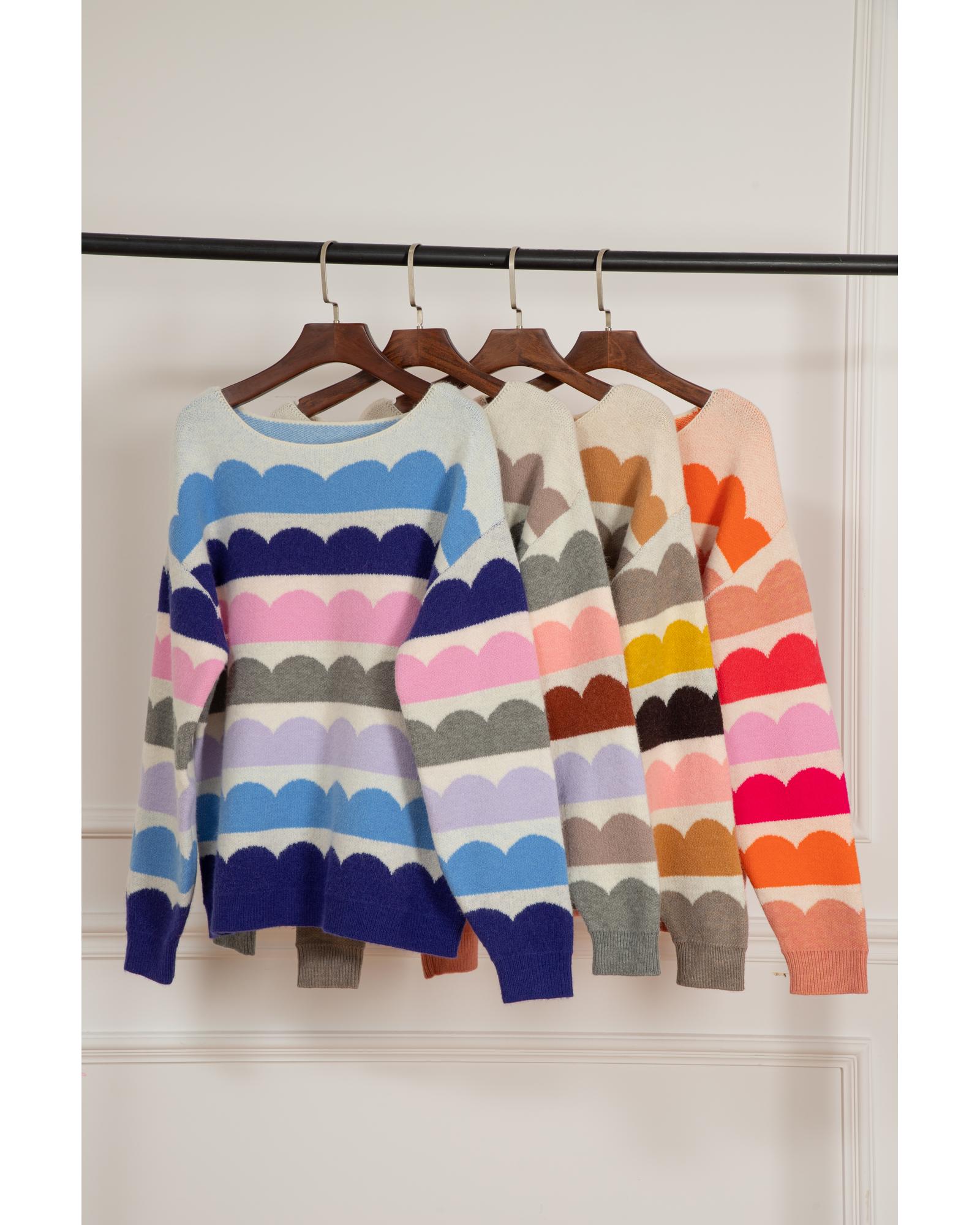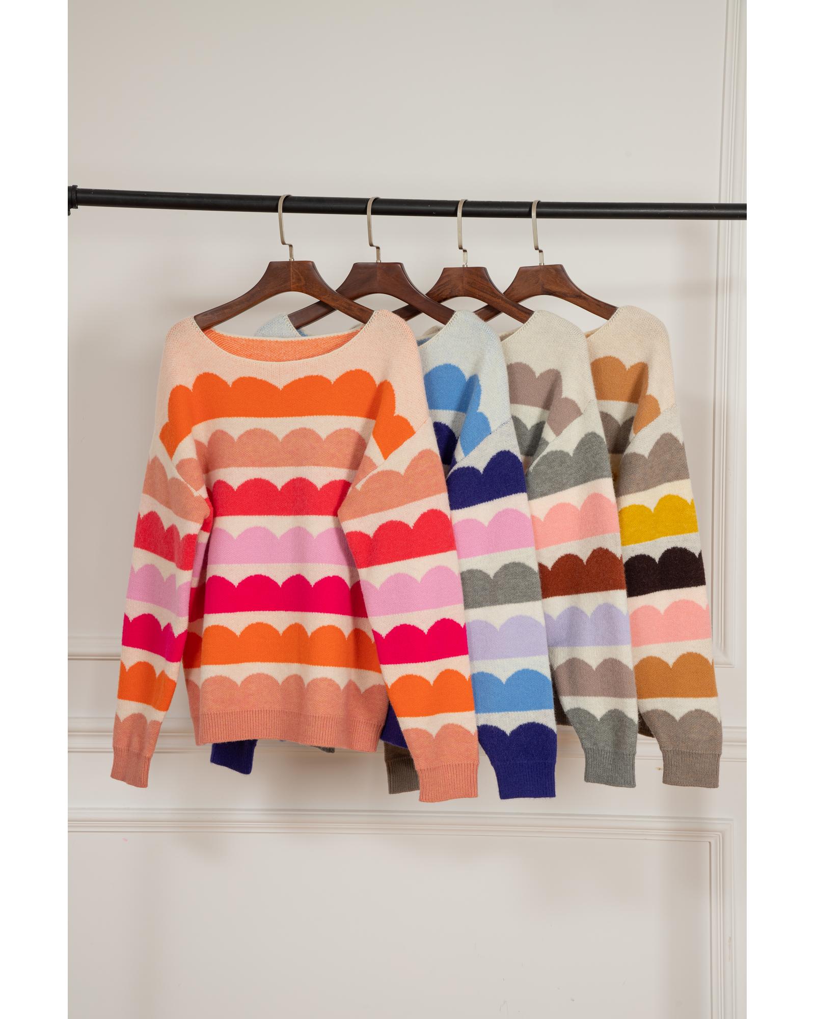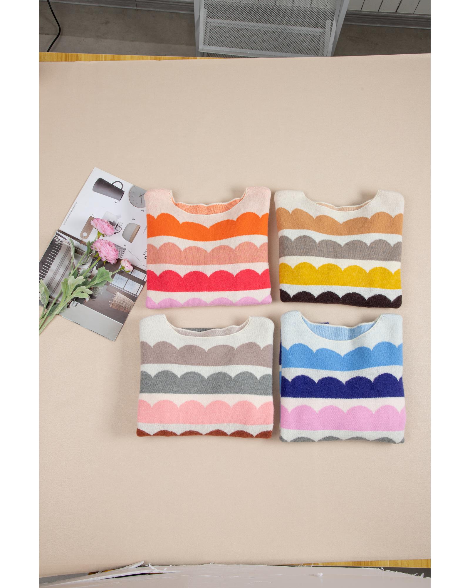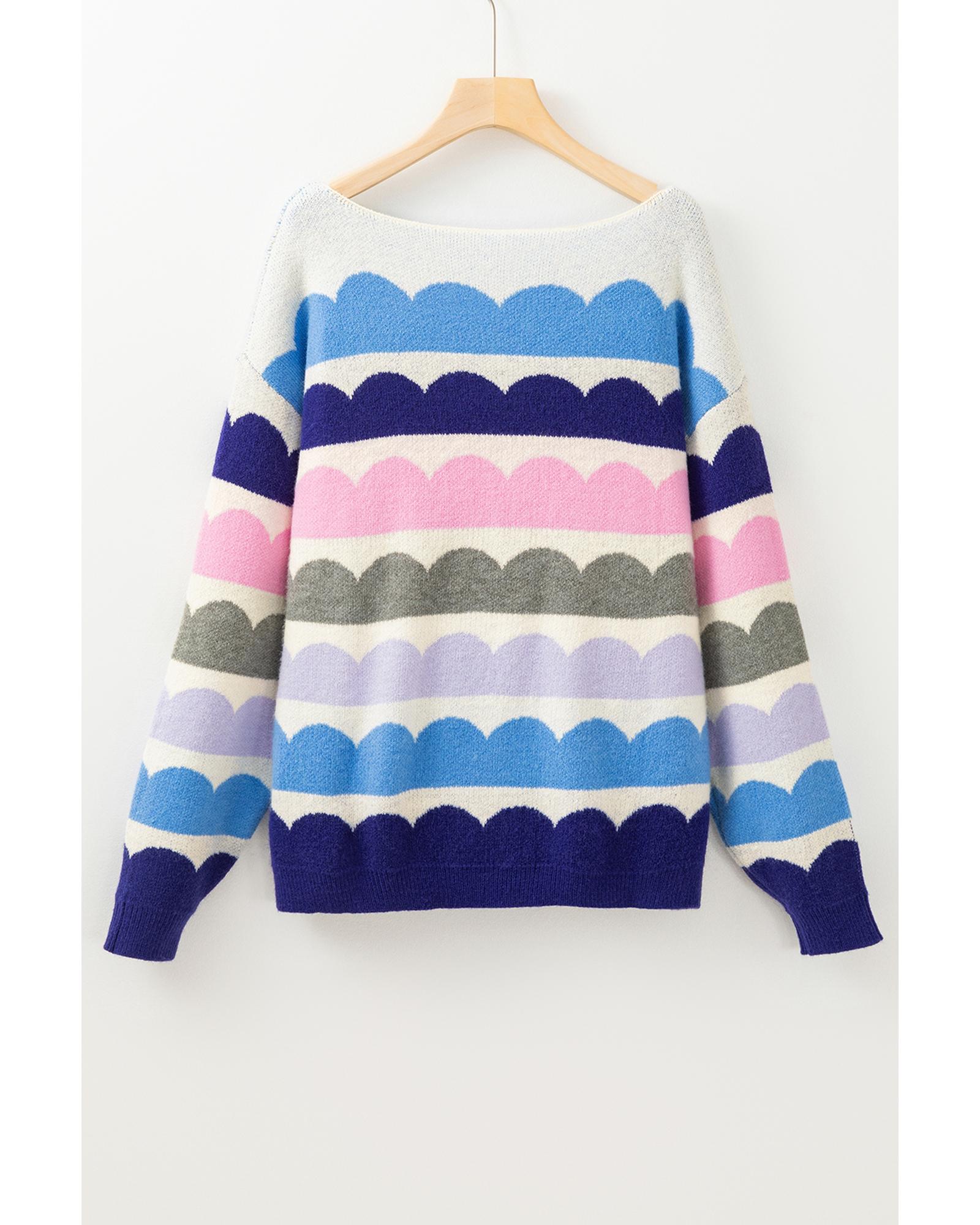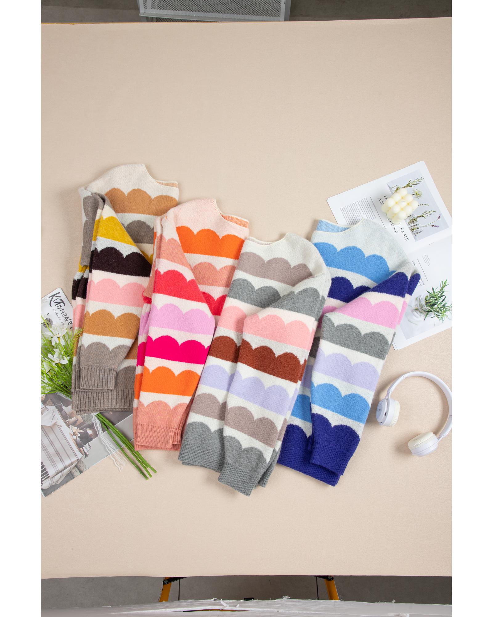 This sweater features a stylish wave striped pattern with balloon sleeves and a drop shoulder design, creating a relaxed and trendy silhouette. Its loose fit offers comfortable casual wear, making it a versatile addition to your wardrobe.