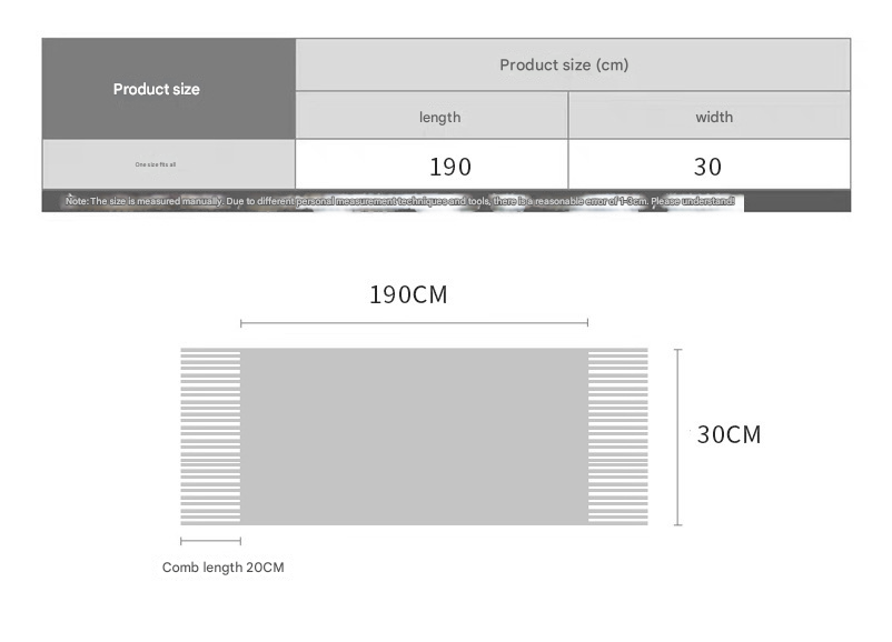 - Size: approximately 190cm x 30cm (excluding tassels)