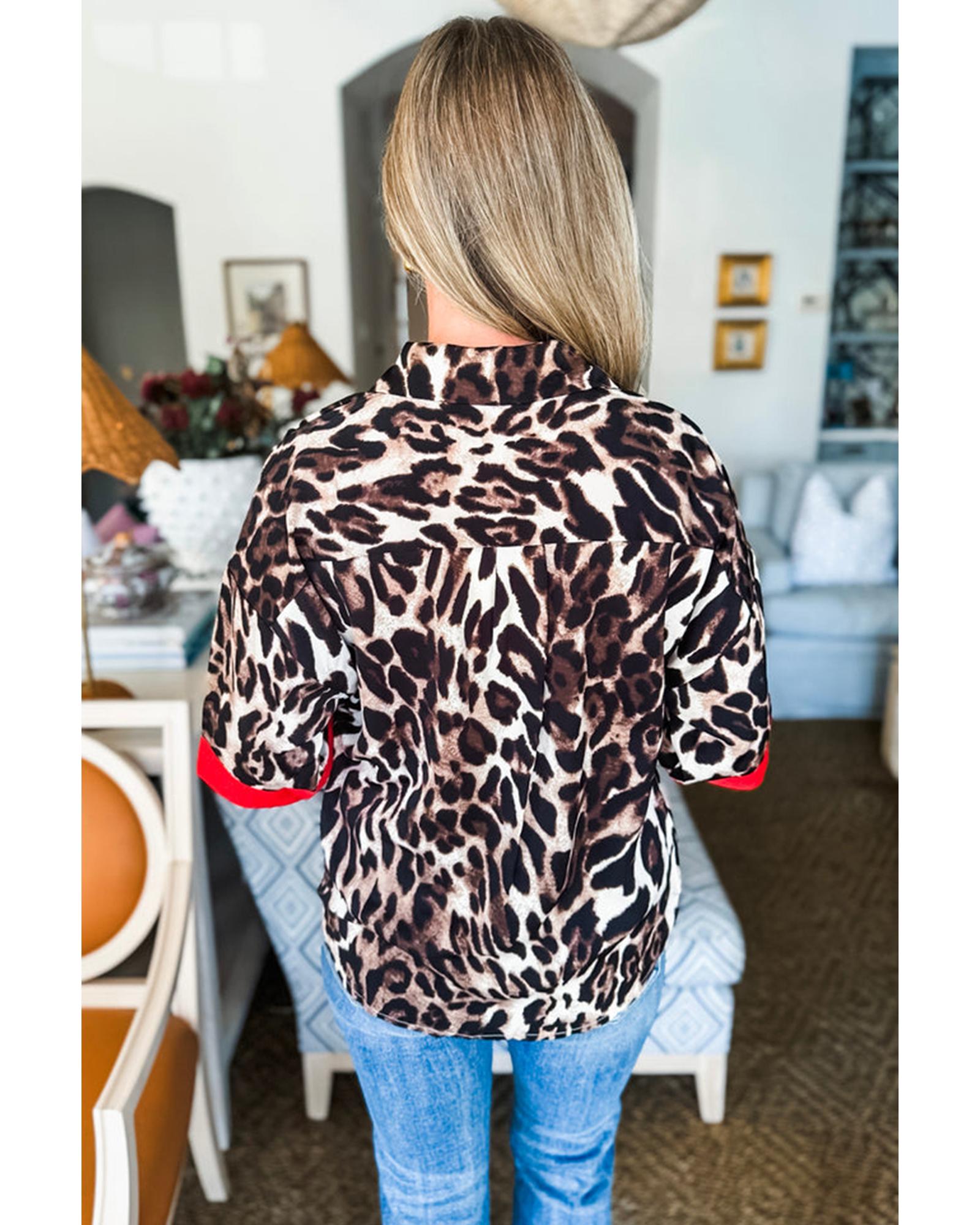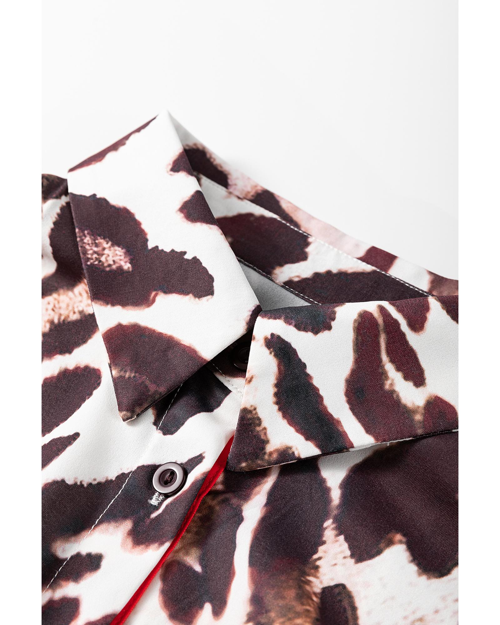 Dark Brown Contrast Trim Patchwork Leopard Print Half Sleeve Shirt – L