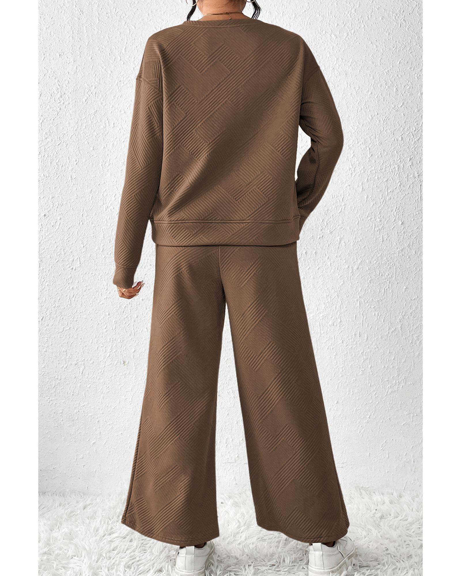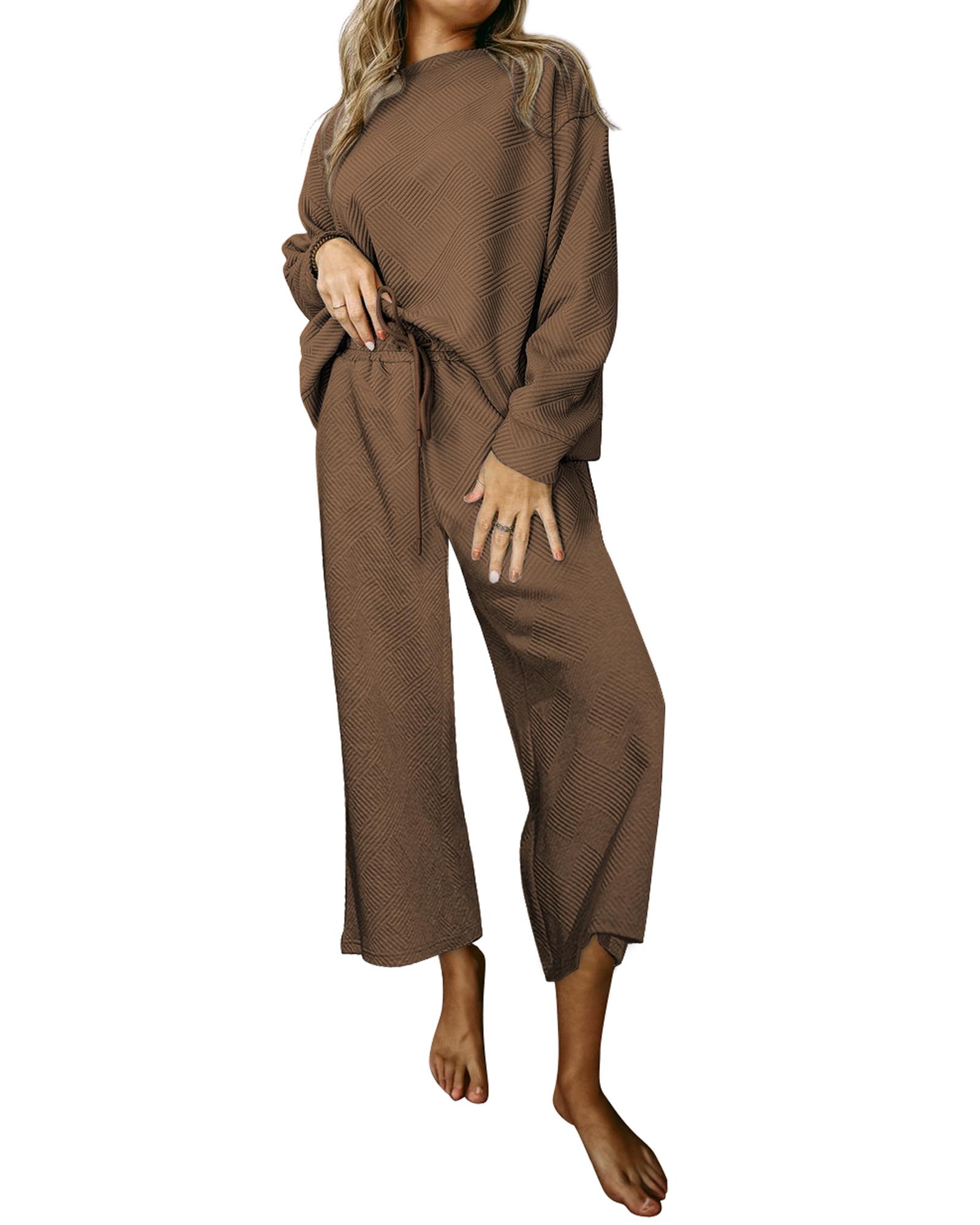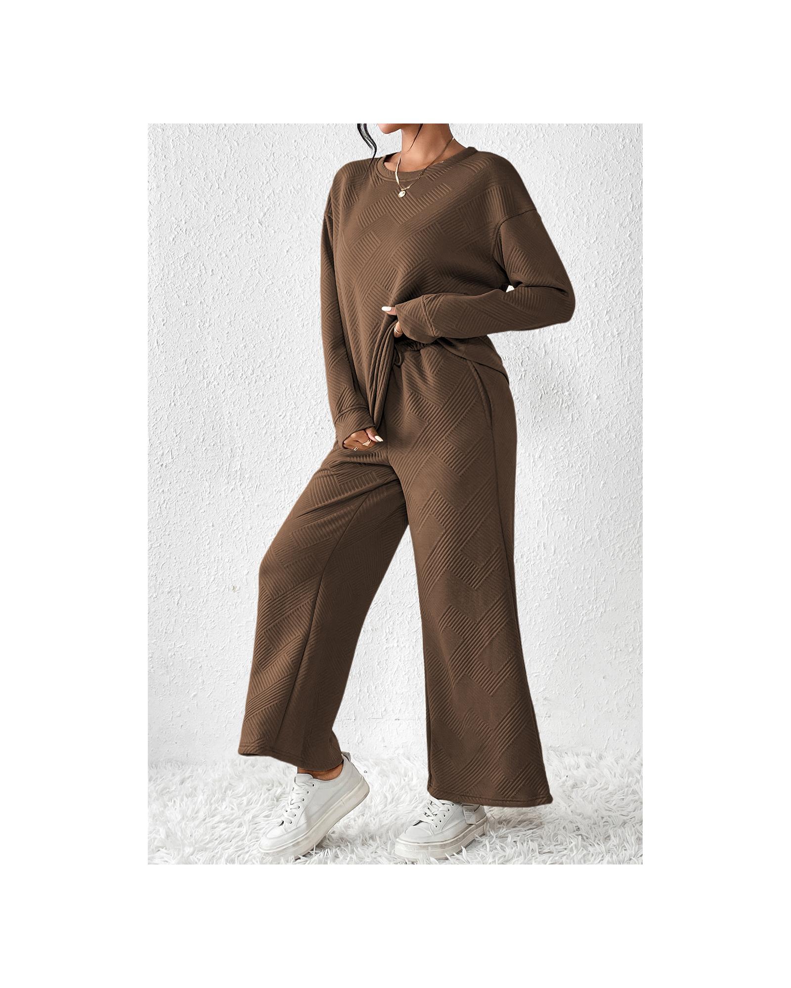 This dark brown, ultra-loose textured outfit offers a comfortable and trendy look suitable for casual wear or home lounging. The set includes a long-sleeved top and wide-leg pants with drawstrings, designed for a relaxed fit and stylish appearance.
