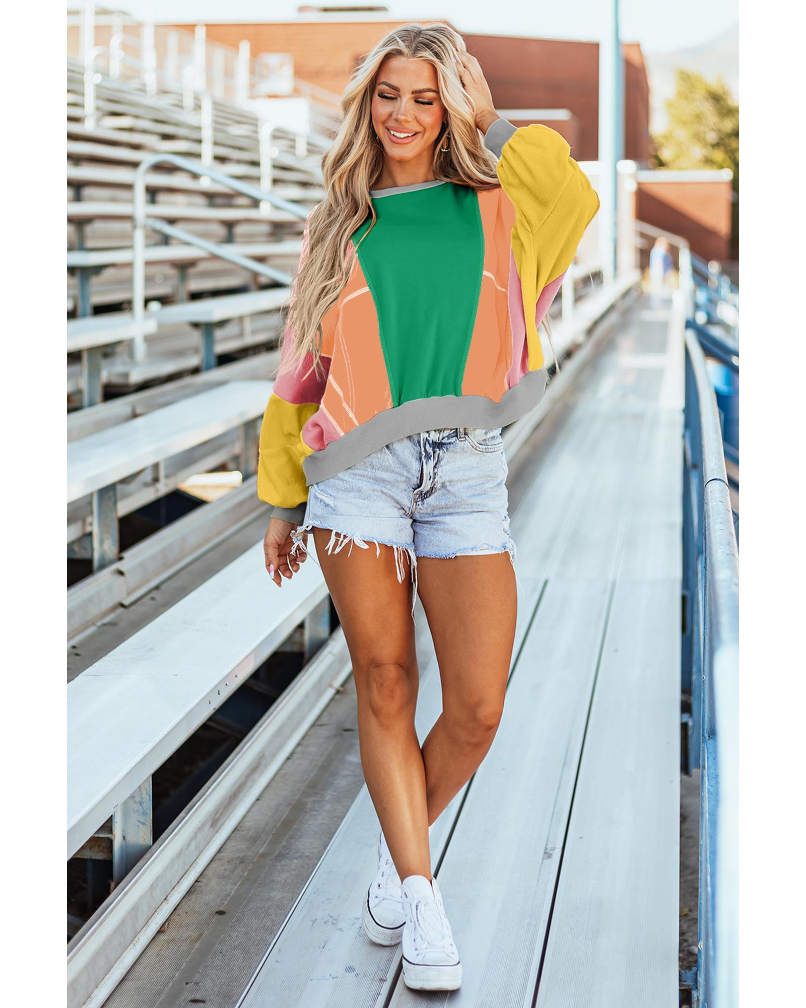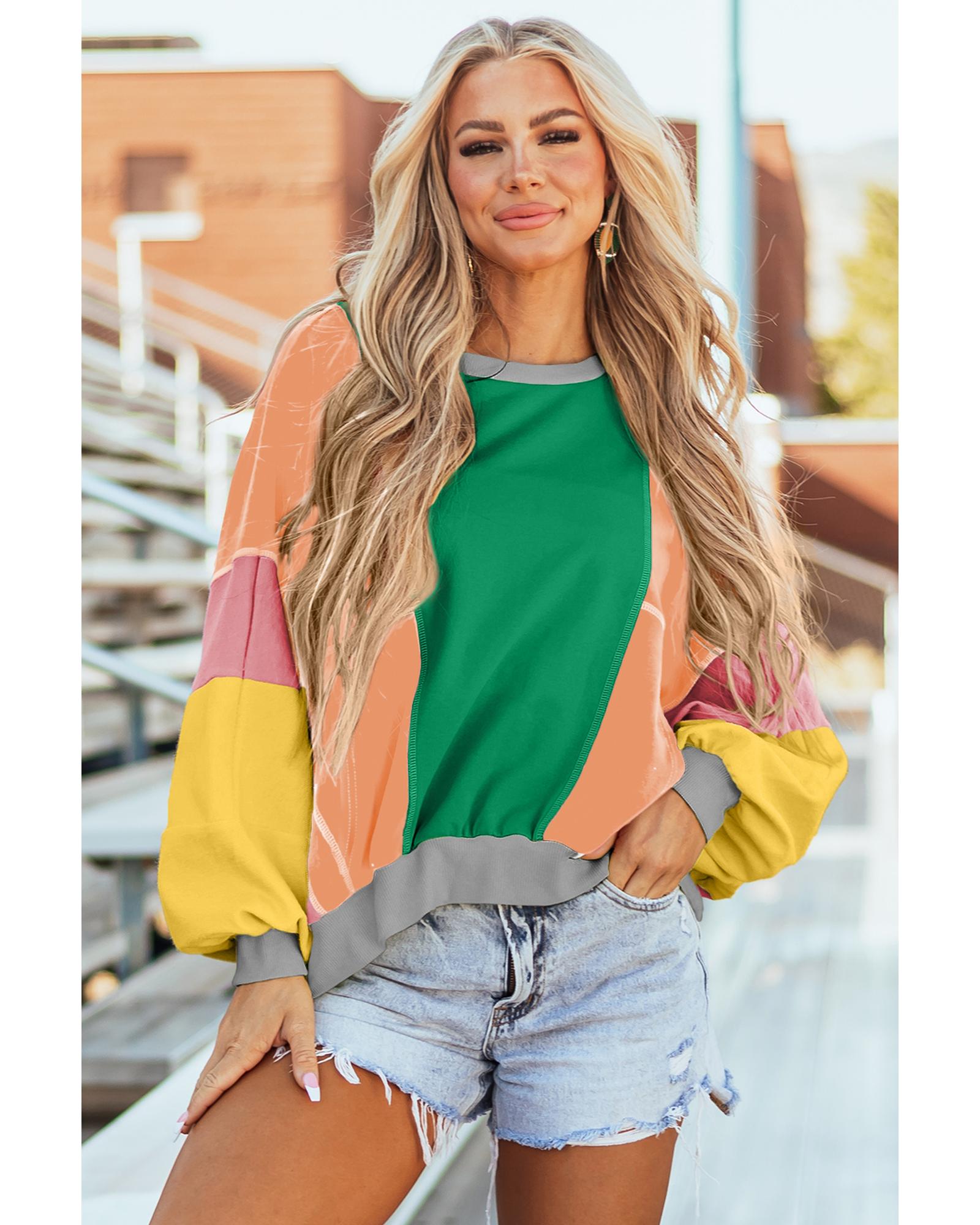 This oversized top features a dark green colorblock patchwork design with exposed stitching details, offering a trendy and flattering silhouette. Its relaxed fit makes it suitable for most body shapes, making it an ideal choice for autumn and winter wear.