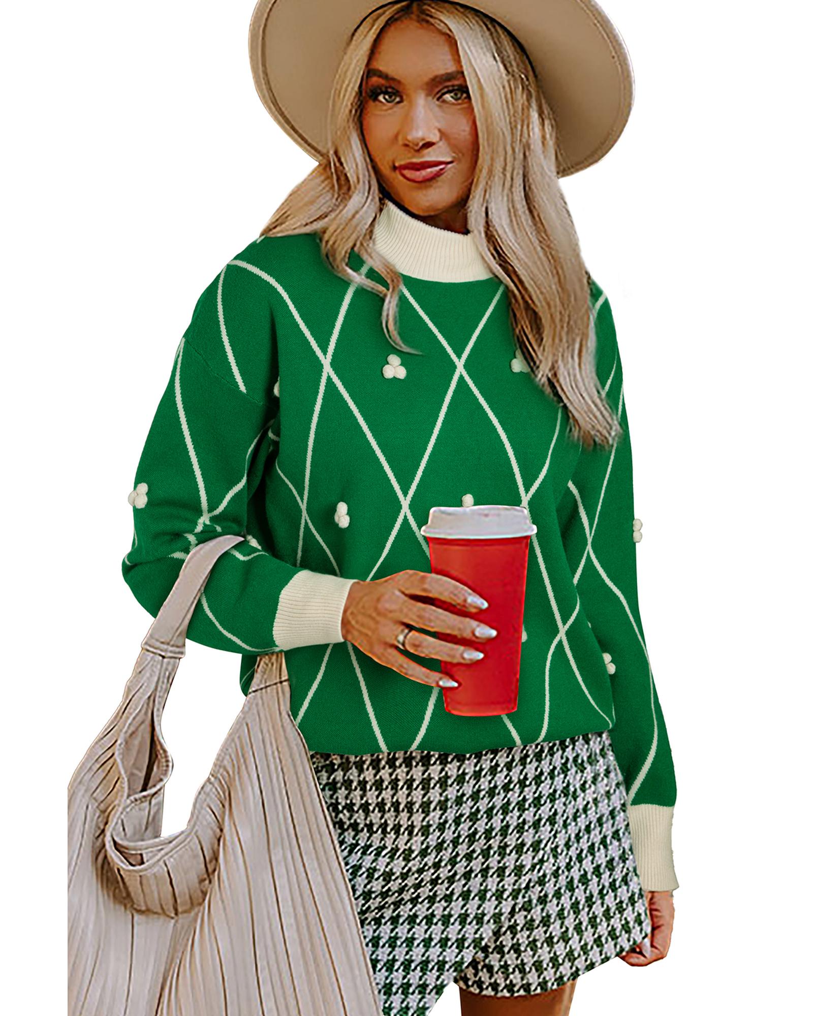 This high-neck sweater features a dark green color with a stylish diamond pattern and playful pom accents. The contrast trim adds a bold color block effect, making it a fashionable choice for festive occasions. Designed with a fitted silhouette, it offers both warmth and elegance, suitable for various sizes and body types.