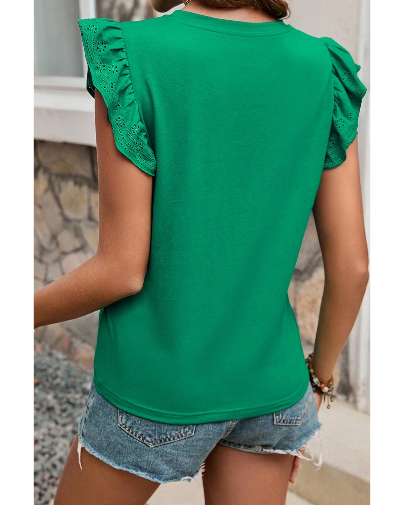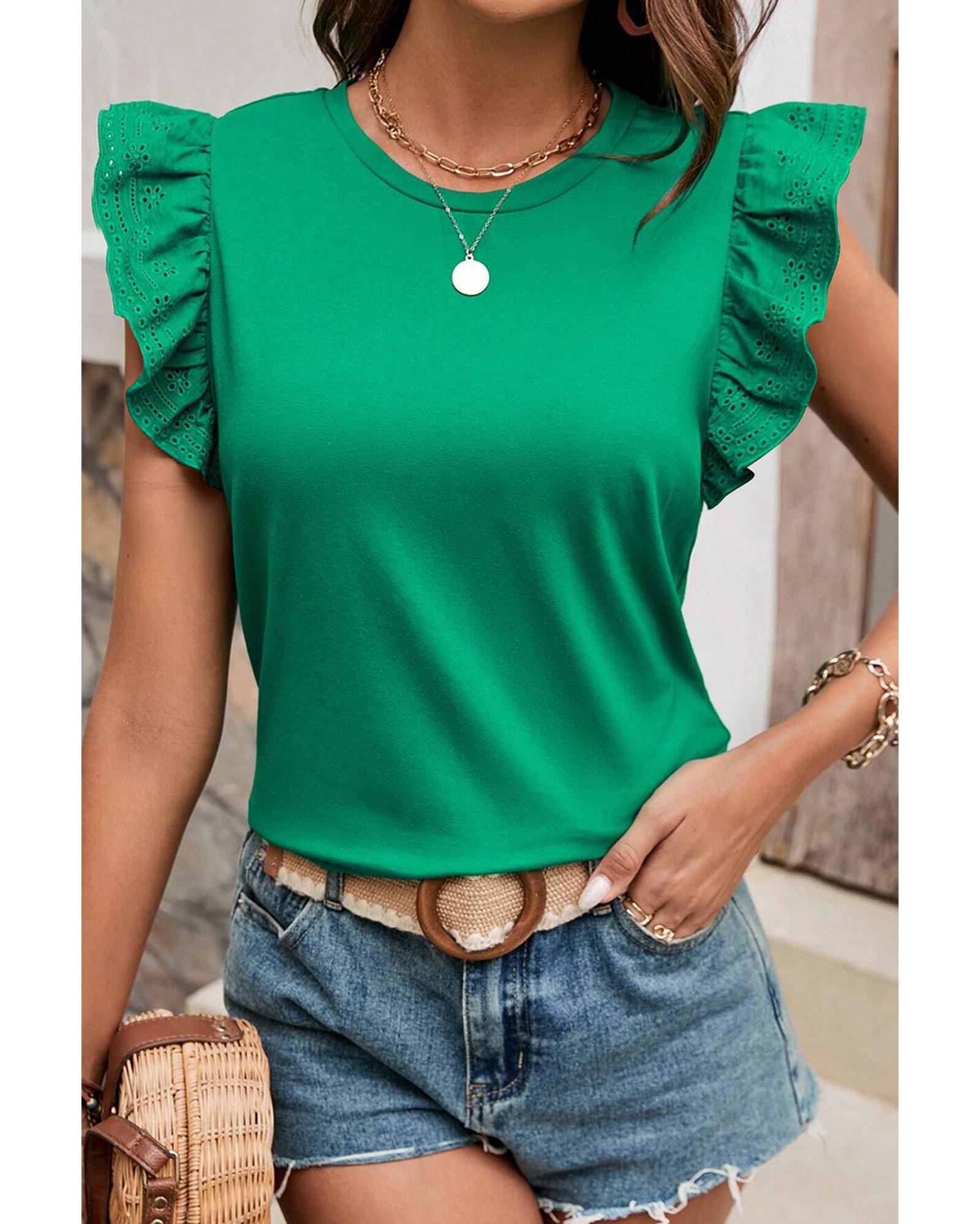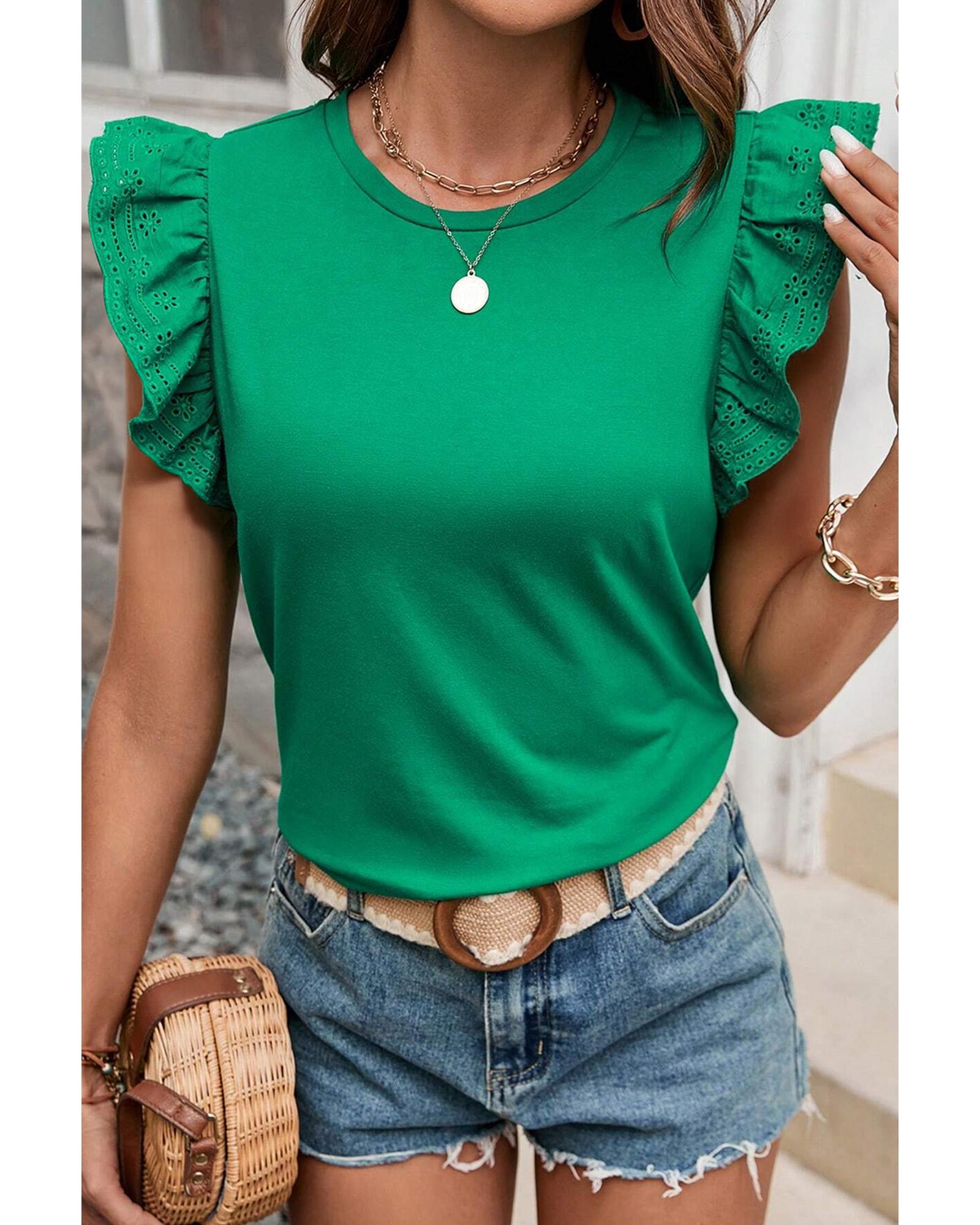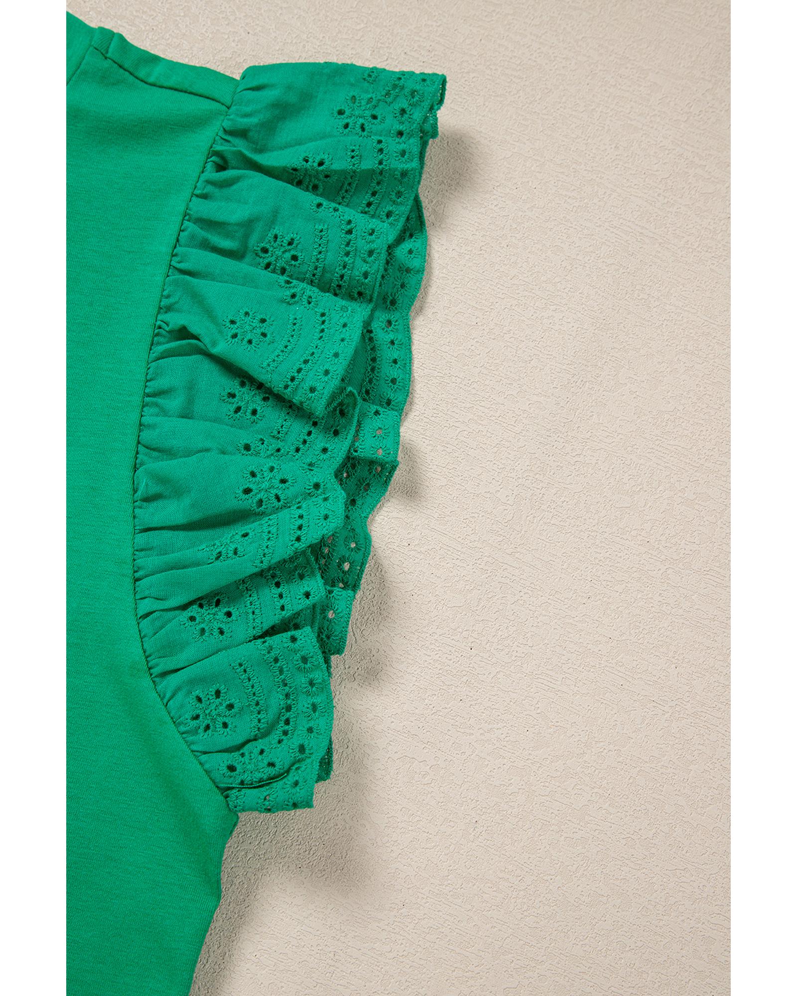 This dark green embroidered top features a slim fit design with ruffled sleeves and a crew neck, offering a stylish and comfortable option for everyday wear. Its versatile color and intricate embroidery make it suitable for various casual occasions.