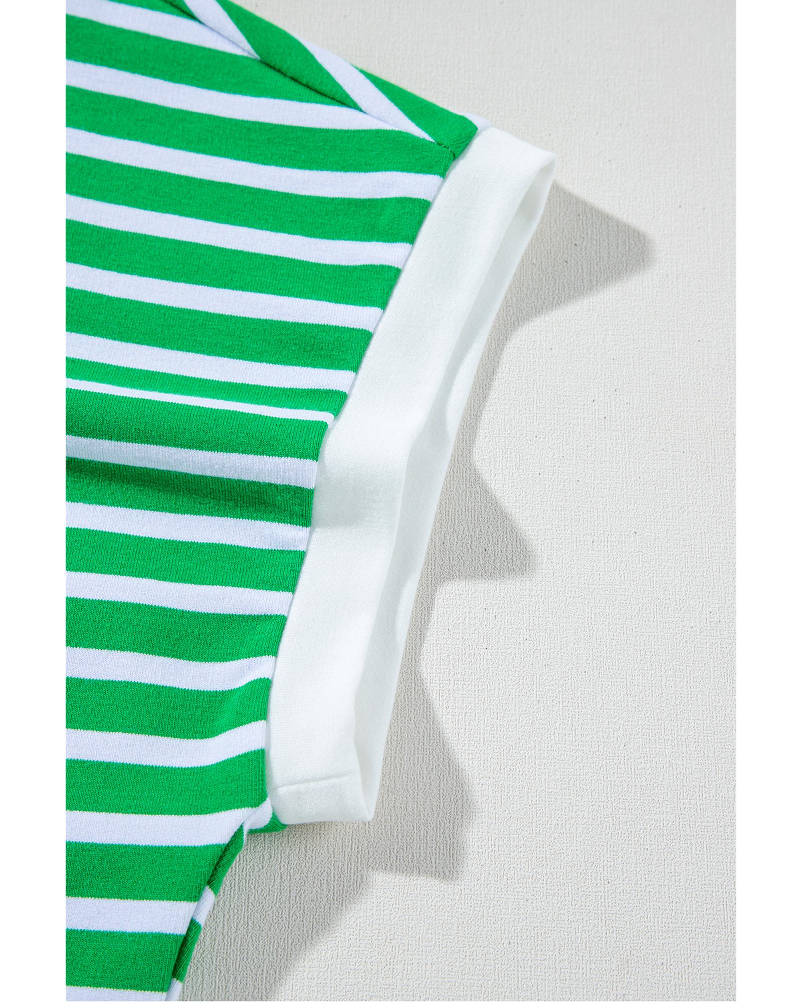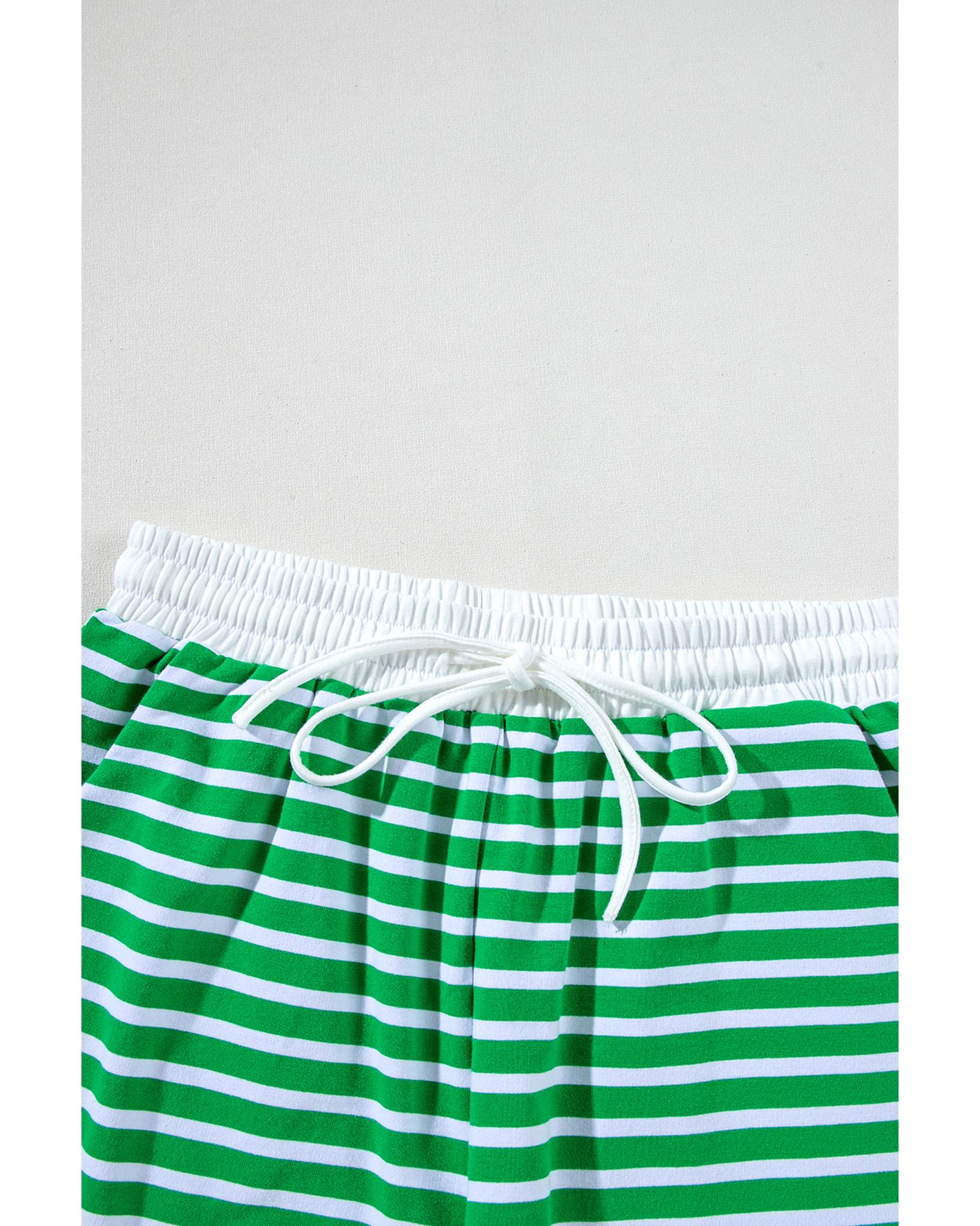 This dark green striped cap sleeve tee and shorts set offers a stylish and comfortable outfit option. Designed with a trendy fitted look, it features a classic striped pattern and a casual yet chic vibe, perfect for everyday wear.